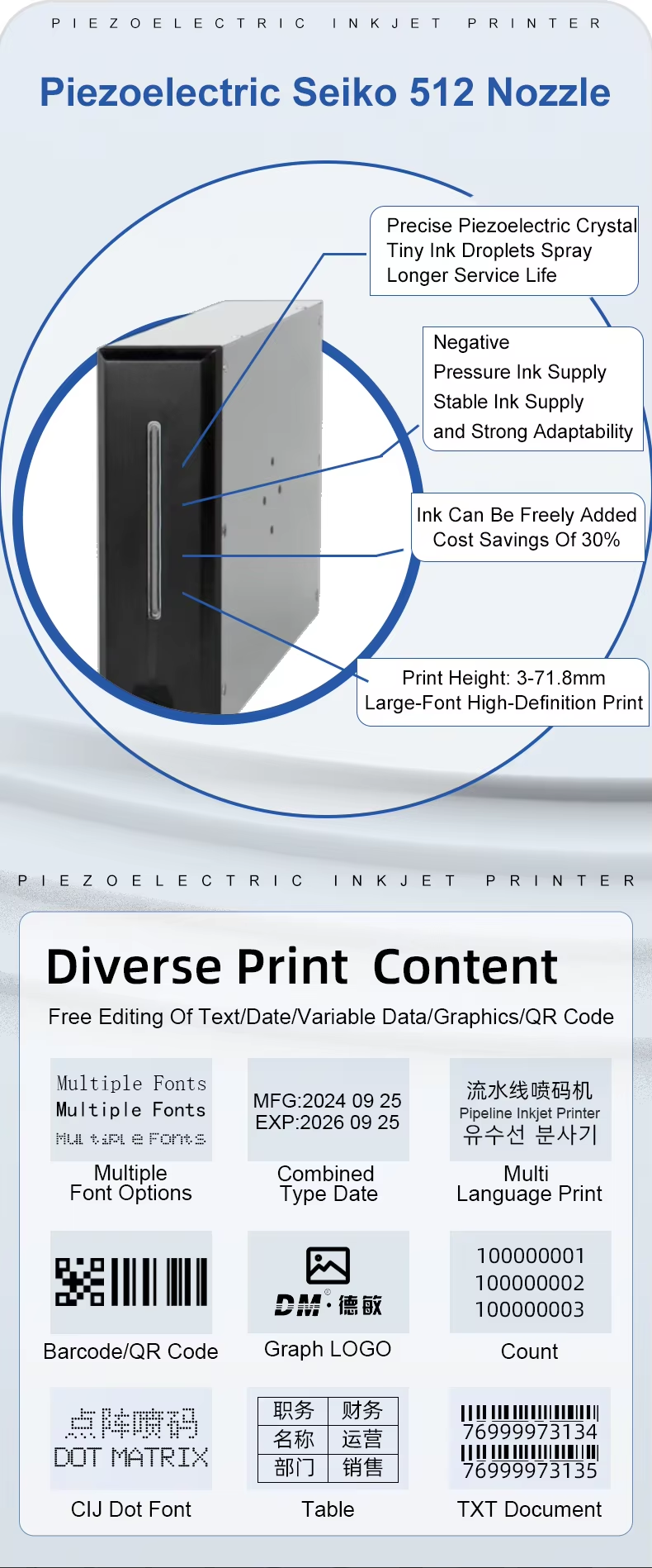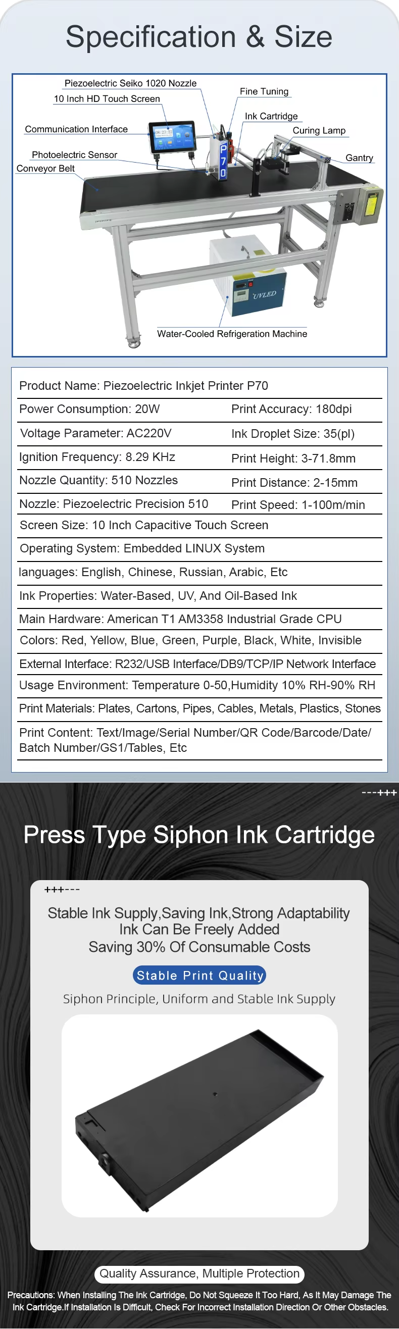 Our main business is: TIJ inkjet printers, CIJ inkjet printers, UV inkjet printers, laser inkjet printers, conveying equipment, accessories and consumables and other products, products are widely used in printing, electronics, plastics, hardware, food and beverage, medicine, cosmetics, tobacco, wood, auto parts, cables and building materials and other fields. At present, we have cooperated with more than 100 countries and regions, including Italy, Spain, the United States, Canada, Mexico, Russia, Vietnam, Thailand and so on. We always adhere to the customer first, continuous innovation and upgrading, and strive to provide all customers with the best products and services, committed to becoming the most reliable supplier!