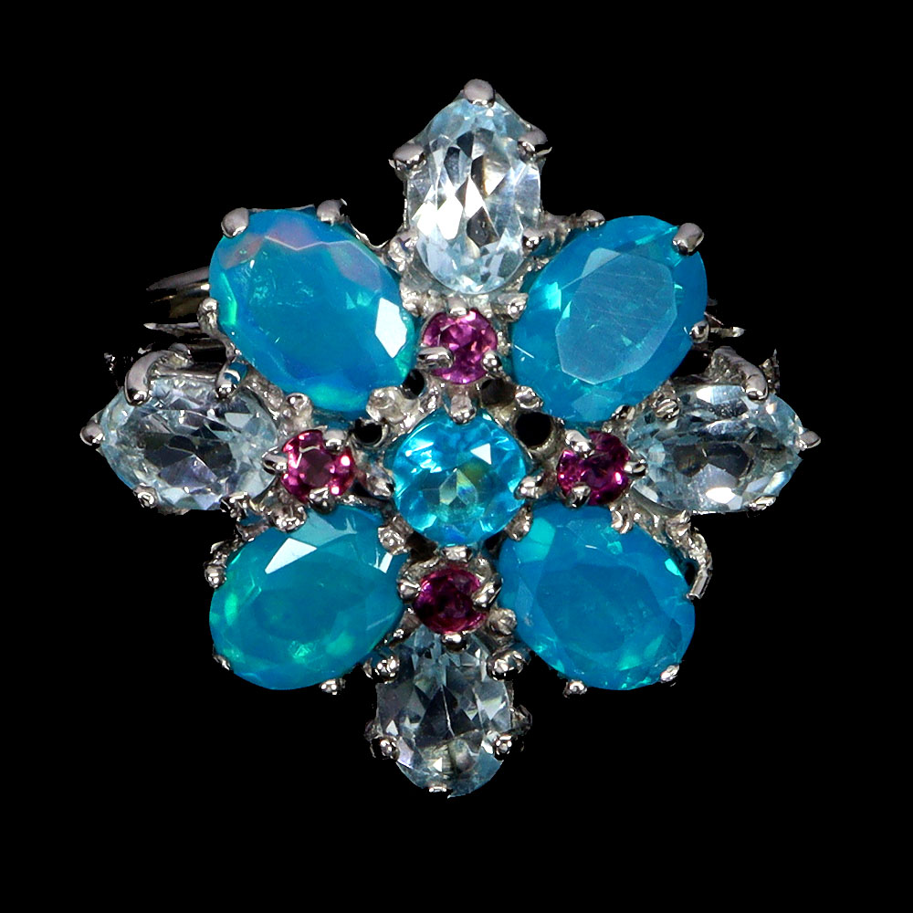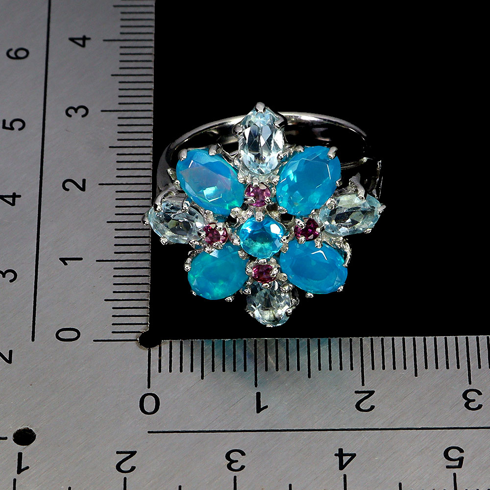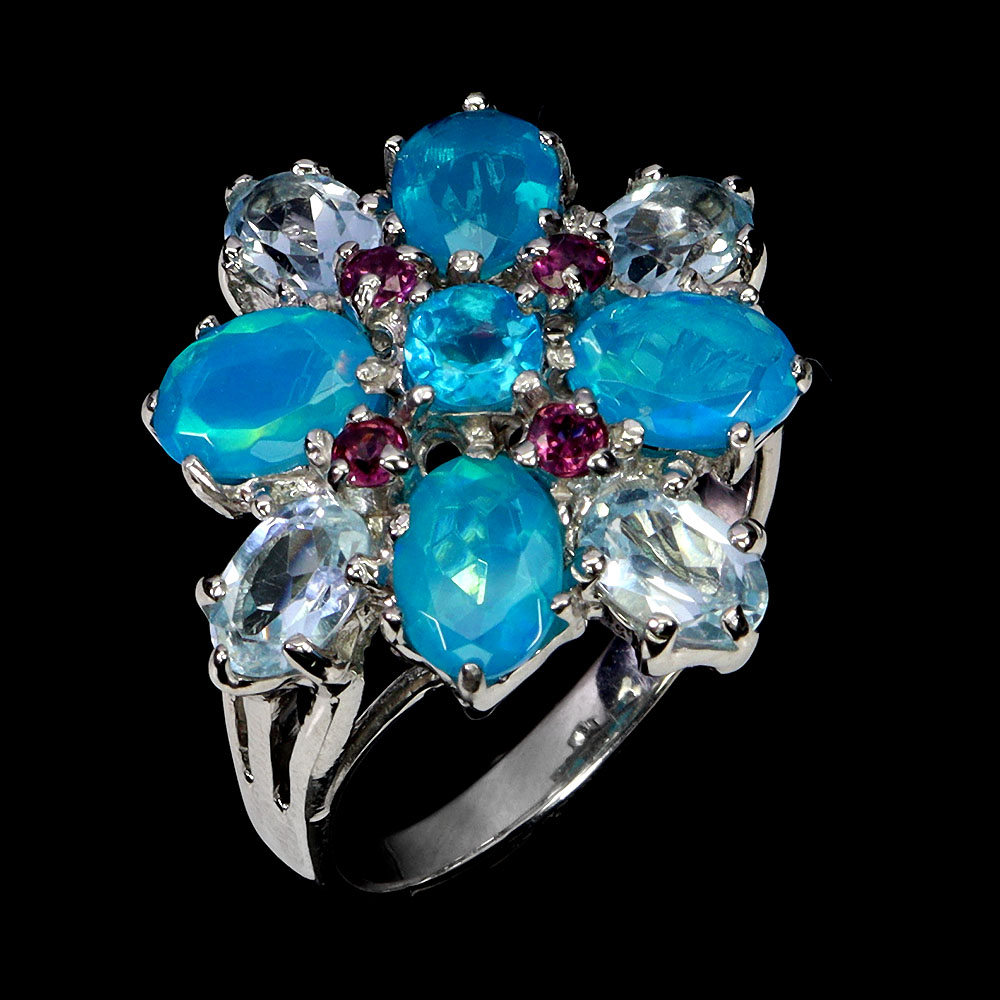 925 Sterling Silver Ring Oval Blue Opal Rhodolite Natural Gemstone Jewelry Size 9