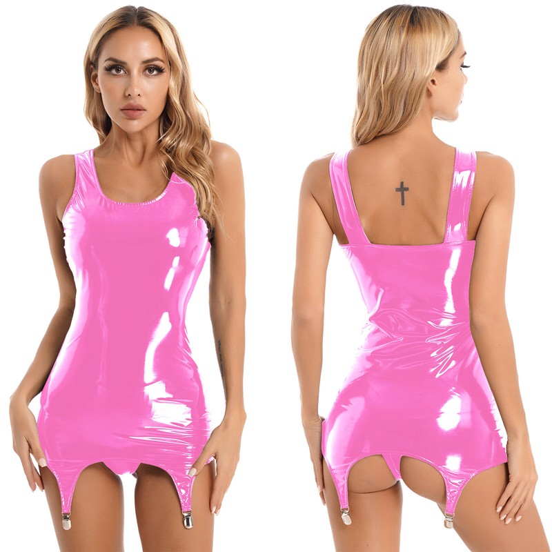Glossy patent leather tank dress for women, sleeveless, u neck, slim fit highlights your body curve.