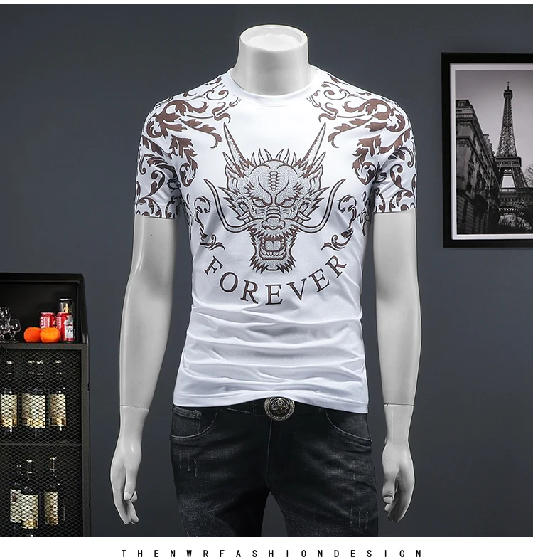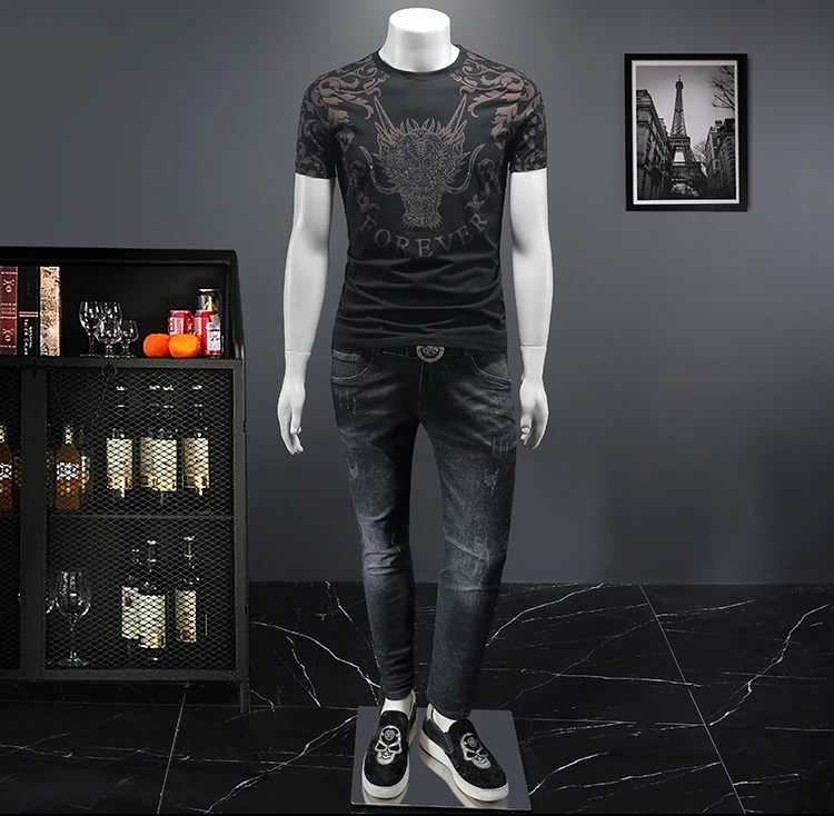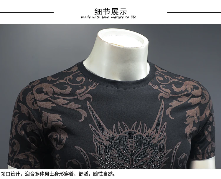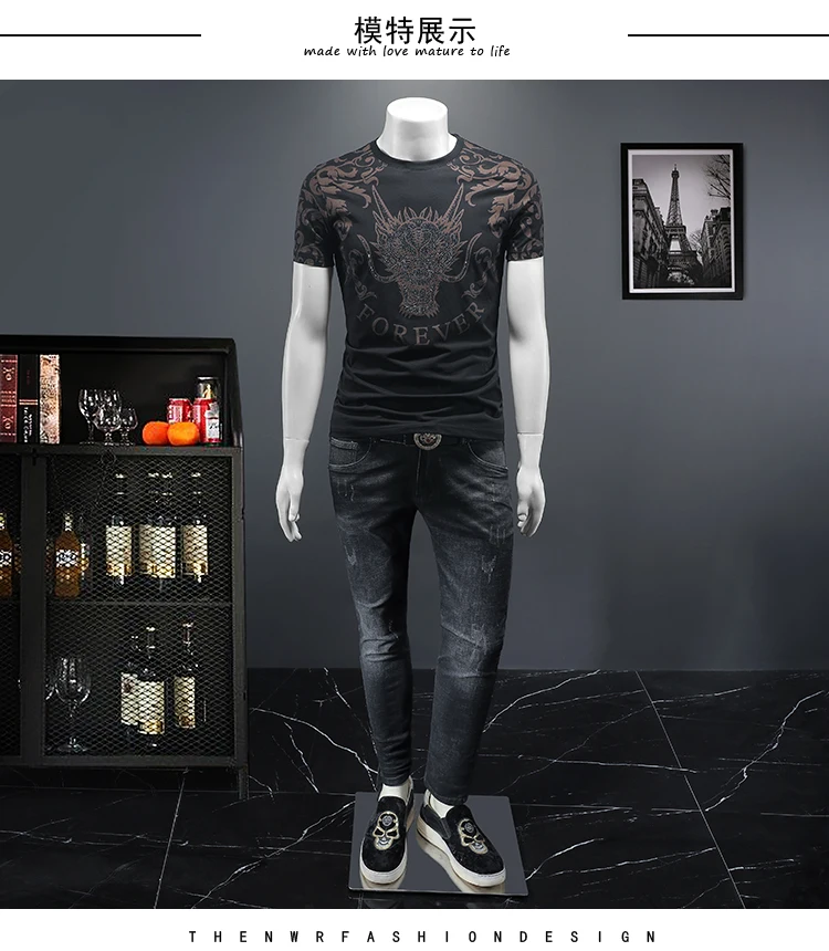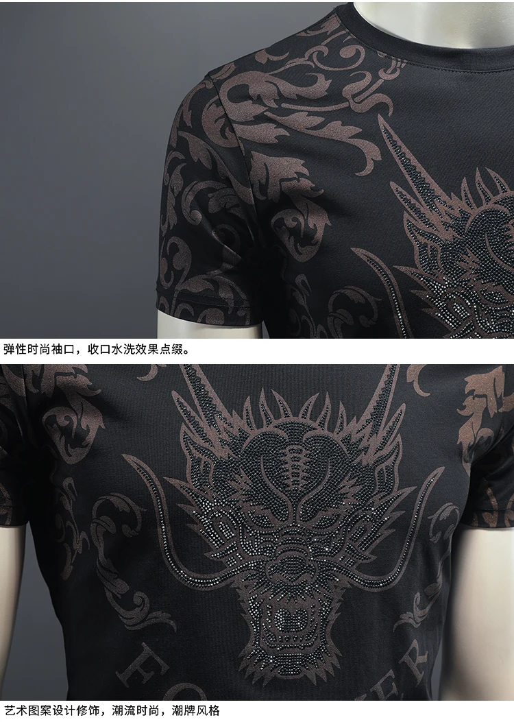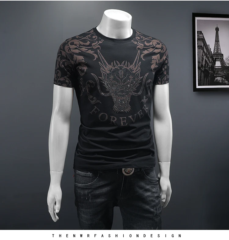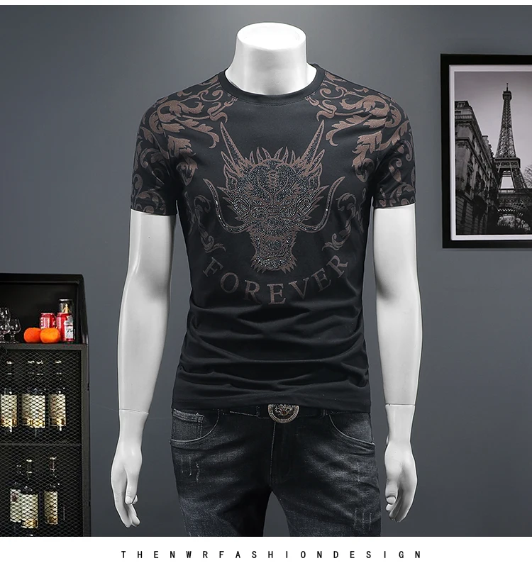New Men Luxury Diamond Dragon Rhinestones Fashion T-Shirt High Quality