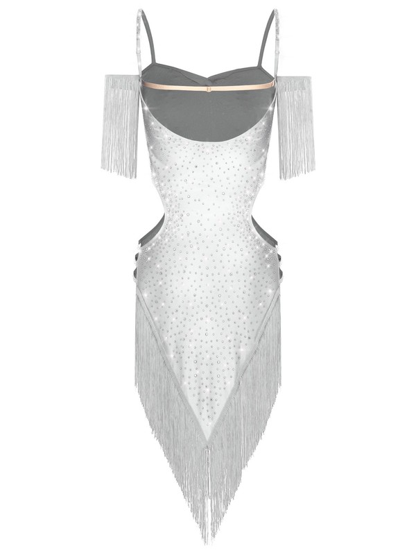 Fringe and shiny rhinestones adorn the dress, creating a dazzling and eye-catching effect on the dance floor, making the wearer stand out.