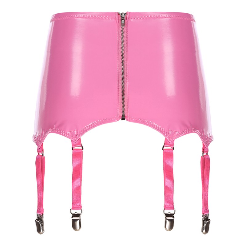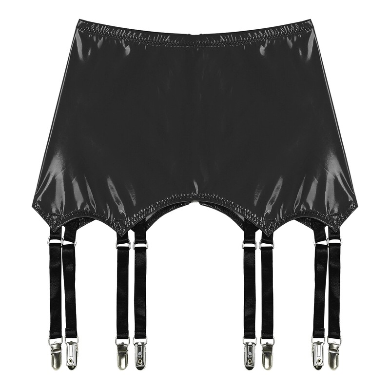 Wet look patent leather garters with metal clips keeps stockings from slipping.