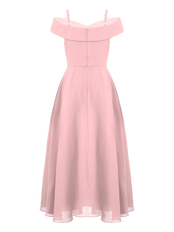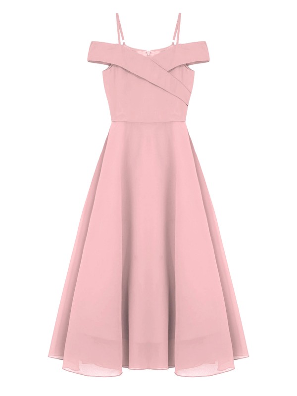 Kids girls elegant chiffon party dress off-the-shoulder adjustable spaghetti strap A-line floor length dress for evening.