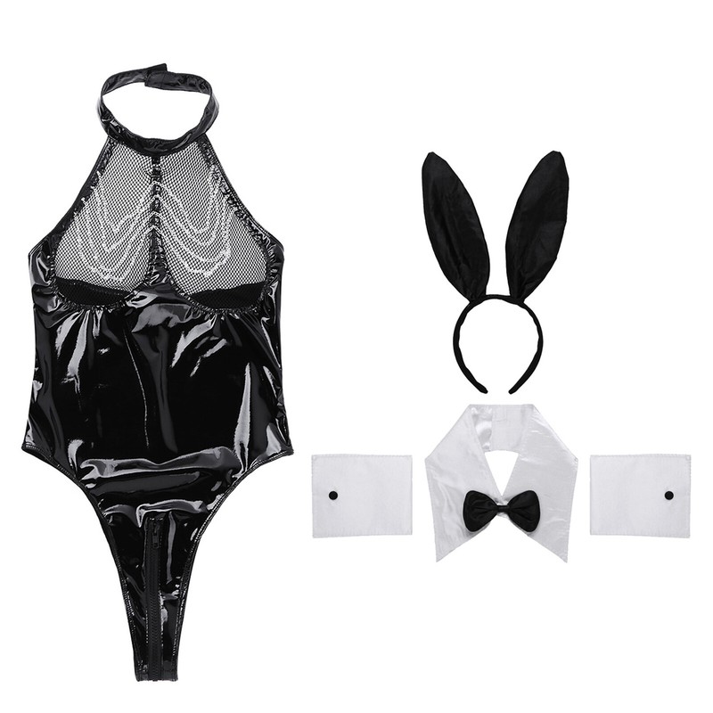 Womens Bunny Costume Sheer Mesh Chest Bodysuit with Rabbit Ears Headband Bowtie Collar Cuffs.