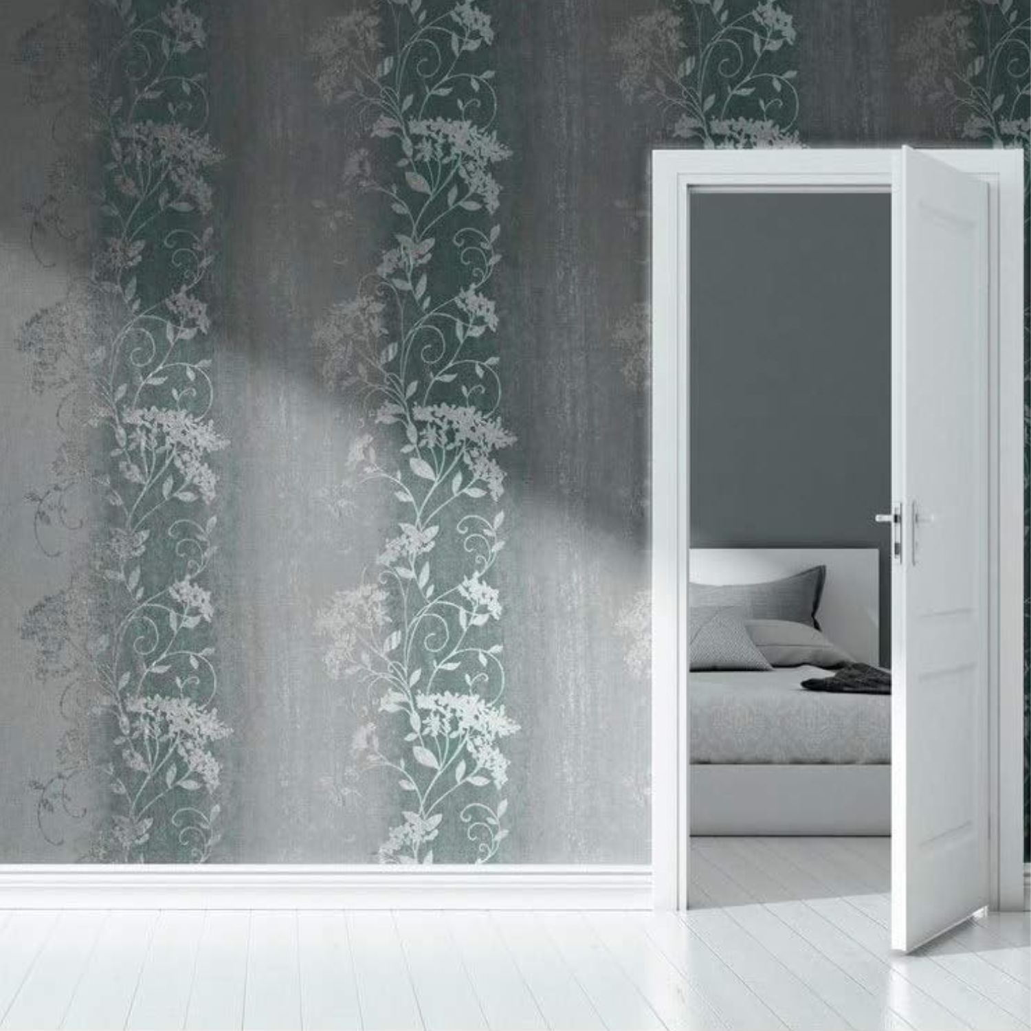Bring elegance and sophistication into your living space with this beautifully designed wallpaper, featuring a refined floral stripe motif in subtle shades of teal/duck egg, silver and grey. The intricate vertical floral patterns are set against a softly textured backdrop, adding depth and a sense of luxury to any room. The alternating stripes create a gentle rhythm on the wall, while the understated metallic highlights catch the light beautifully, enhancing the room’s ambiance. Crafted from durable heavyweight vinyl, this wallpaper is both washable and peelable, making it as practical as it is stylish.