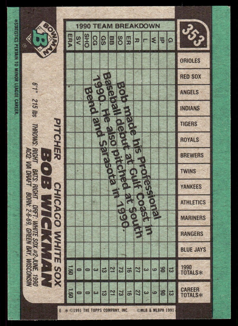 | 1991 Bowman Bob Wickman Rookie Chicago White Sox #353 |