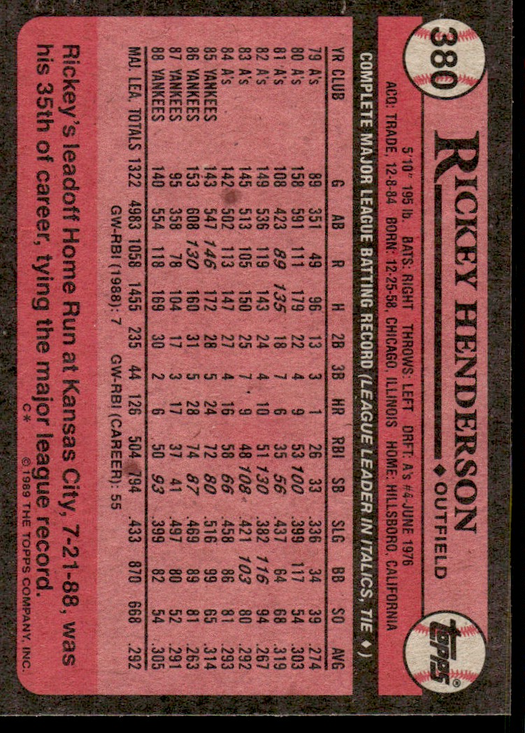 | 1989 Topps Rickey Henderson New York Yankees #380 |