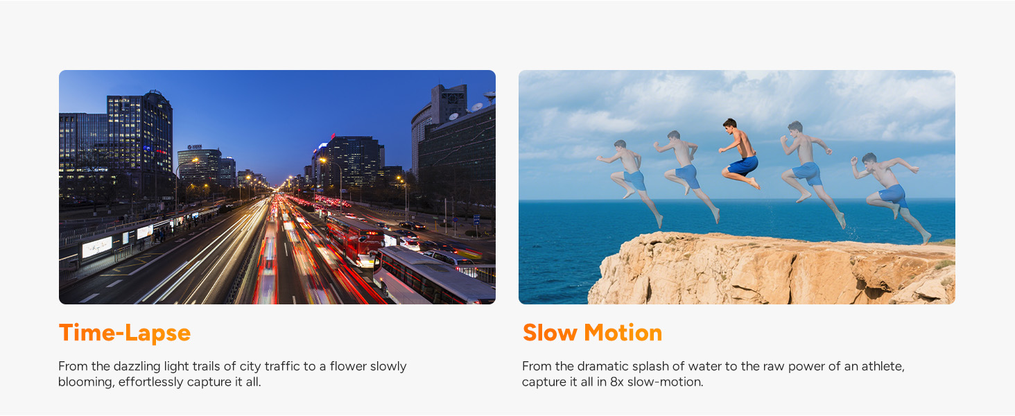 Advanced Image Stabilization System: Equipped with 6-axis Electronic Image Stabilization (EIS) and horizon correction, ensuring smooth and clear videos even during action shots or in shaky environments. Offers multiple shooting modes: loop recording, slow-motion video, time-lapse photography, burst shooting, and timed shooting