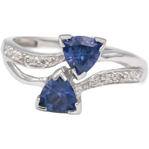 Discover the allure of this exquisite ring, featuring trillion cut simulated blue sapphires. The primary sapphires weigh approximately 1.0 carat, offering a deep, mesmerizing hue.