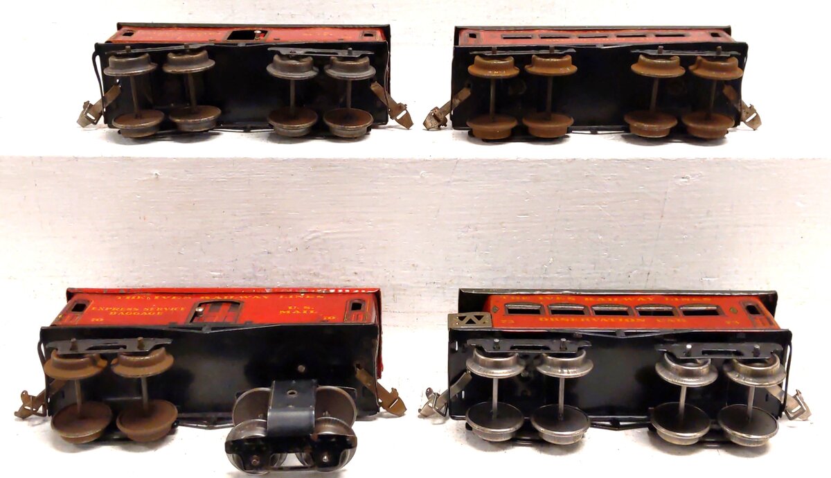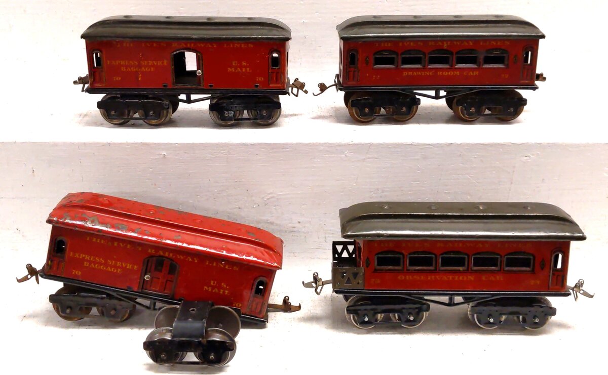 Here are [4] Ives Vintage O Prewar Assorted Ives Railway Passenger Cars: 70, 70, 72, 73. These cars feature metal bodies, metal wheels, metal axles & metal latch-type couplers.