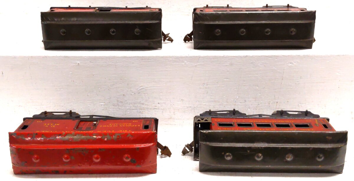 Per our grading of this item, it is equivalent to the TCA rating of R-2: Fair. The bodies to all 4 cars appear original, however the #73 chassis appears to have been previously repainted. There are heavy nicks & scratches across the metal bodies of all 4 cars. The red painted roof on one of the #70 cars shows severe paint loss/chipping. The red roof #70 car shows a detached truck & wheels from the body. The wheels, axles & couplers on all 4 cars show signs of rust & tarnish. The original box is included. The instruction manual is not included. Please check the photos for a detailed look at this item. Overall condition is Restored - Fair.