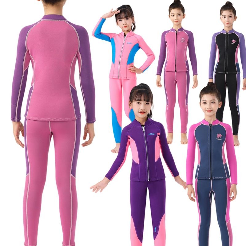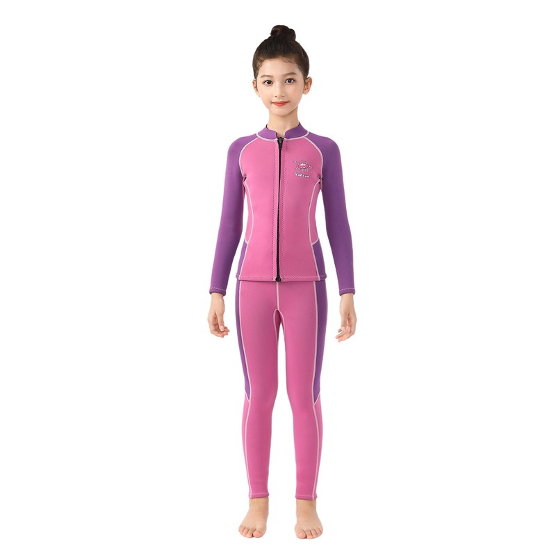 Two pieces neoprene swimuit set for girls, are designed with long crew neck, long sleeves swim tops with front zipper, and elastic waist pants.