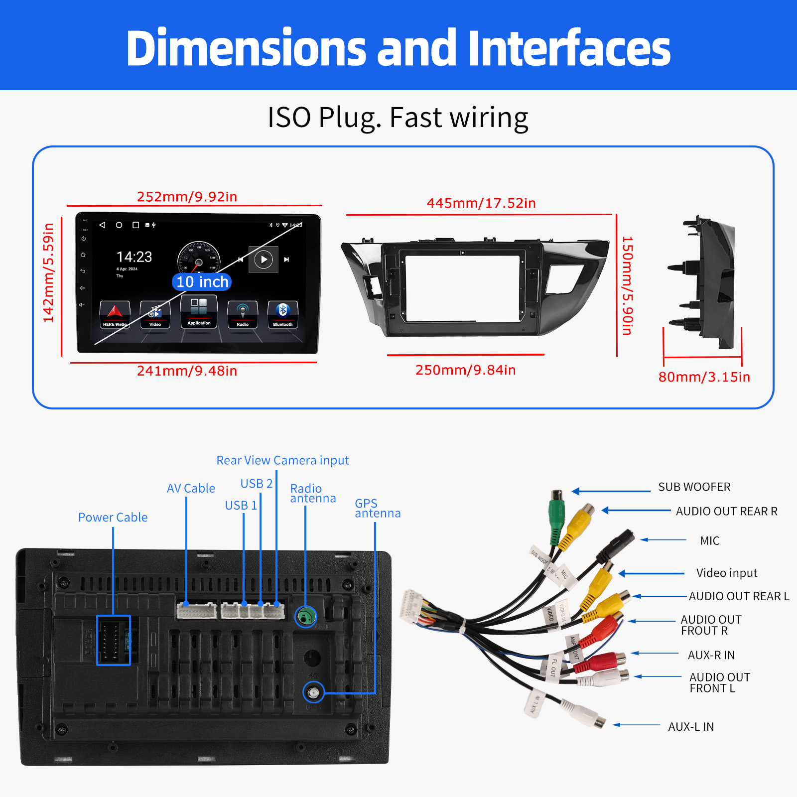 10.1 Inch Android 14 Car Radio For Toyota Corolla 2014-2016: The Android car radio with 10.1" 1280* 720 IPS capacitive touchscreen, 4GB RAM and 64GB ROM allows you to download your favorite apps and videos, so driving is no longer boring. No extra frame, no cable change, plug and play.