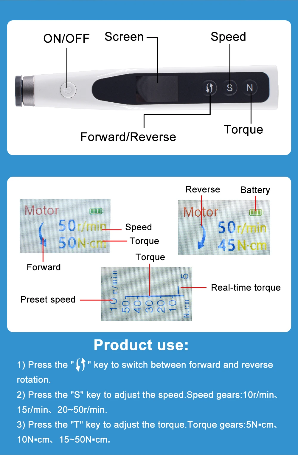 3) Press the" T" key to adjust the torque.Torque gears:10N-cm、 20N-cm、 30N-cm, 40N.cm 50 N.cm.