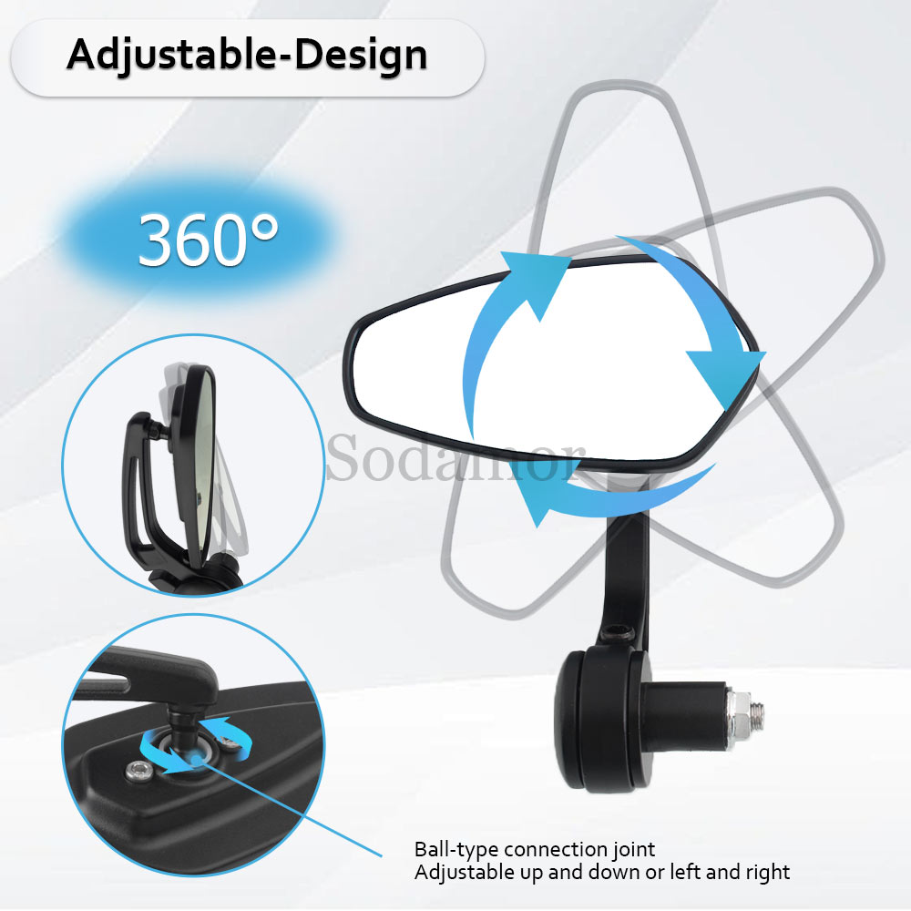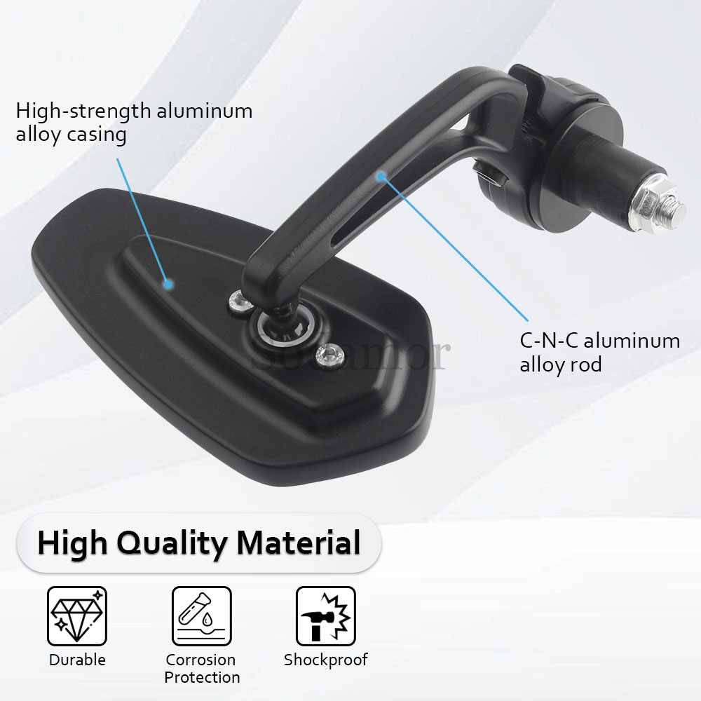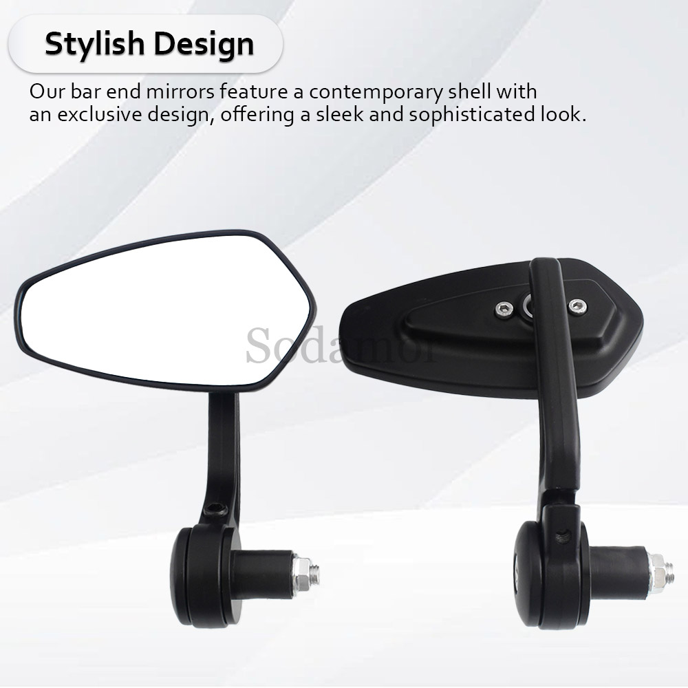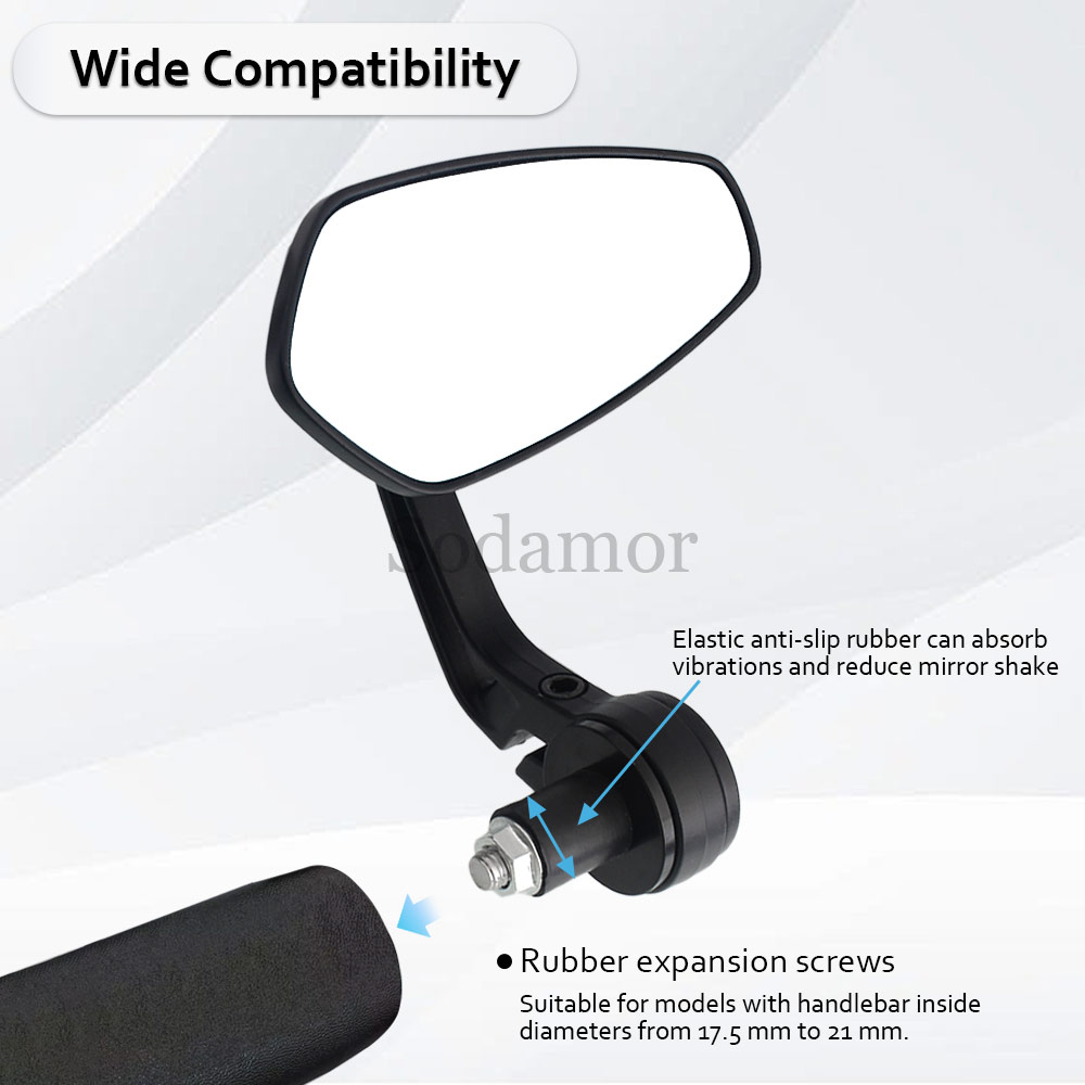 Specification: Item Name: Motorcycle Handlebar Bar End Mirrors Color: Matte Black (matte black will be more dirt-resistant, Not easy to leave fingerprint marks) Glass:White glass Material: Aluminium Alloy + Glass Size: As picture shown Feature: 1.High Quality Material: Using high-strength aluminum alloy casing, C-N-C aluminum alloy rod, ensuring maximum strength and durability, durable use, shockproof and corrosion resistant, suitable for In all weather conditions, you can ride your motorcycle on the road at any time without worrying about damage. 2.Adjustable-design: Design of Ball-type connection joint and adjustment holder, this round style bar end mirror can be 360 degrees rotated and freely adjusted up & down or sideway ,for better visibility! 3.Wide And Clear View: Motorcycle bar end mirror, 4.2"x2.2" Mirror glass for an extended field of vision.Help you easily see the upcoming motorcycles. Widen your vision and keep your driving safety. 4.Wide Compatibility: These side mirrors come with 2 rubber expansion screws(Elastic anti-slip rubber can absorb vibrations and reduce mirror shake), which are suitable for a handlebar inner diameter of 17.5 mm to 21 mm. So suitable for most brands of motorbike, Street Bike, ATV, Dirt Bike, Bicycle and Scooter, Fits for Most Harley Davidsons, fit for Suzuki, fit for Cruiser Chopper, fit for Honda, fit for Kawasaki Cruisers, fit for Touring Bikes, fit for Sport Bikes, fit for Electric Scooters etc. 5.Stylish Design: Our bar end mirrors feature a contemporary shell with an exclusive design, offering a sleek and sophisticated look. Elevate your motorcycle's appearance and add a distinctive touch of individuality with this striking upgrade. 6.Easy to Install: Featuring an innovative rubber expansion screw design, our mirrors offer a quick and straightforward installation process. Even beginners can set it up in no time, allowing you to promptly benefit from your new accessory. Fitment: Fit for motorcycles and sports bikes with standard 0.68"(17.5mm)-0.83”(21mm) diameter handlebars. Fit for Honda,for Yamaha, for Kawasaki, for Ducati, for Suzuki, for Aprilia, for BMW, for Cafe Racer, for scooter, for dirt bike, for quad bike, for snowmobile, for motorcycle, for Bicycle, for electric scooter, ATV, ect. Such as Fit for : Compatible for Kawasaki: for Street bike : Z1000 / Z750 / ER-6F / ER-6N for Cruiser and chopper: VN series for Dirt bike : Versys / KLX series Compatible for Suzuki: for Street bike : B-King / GSF1250 / GSF600 / Gladius SFV650 / SV650 / SV1000 / GSR600 for Cruiser and chopper : Boulevard / Intruder / Volusia for Dirt bike: V-Strom / DR series for Scooter: Skywave / Burgman series / Gemma Compatible for Yamaha: for Street bike : XJR1300 / XJ6 / V-max / MT-01 / MT-03 / TDM900 / FZ1 / FZ6 / YBR for Cruiser and chopper: XVS950 / XV1900 / XVS1300 / V-Star / Virago / Warrior / Royal Star for Dirt bike : XT660 / WR250 / WR125 / XT125 for Scooter: Majesty / X-Max / X-City for 50 90 300 DVX / Thundercat / Arctic Cat H1 / Can-Am ATVs / DS / DS 250 450 650 / Renegade for 500 800 / Outlander 400 500 650 800 Compatible for Honda ATVs: for TRX 90 / TRX450R / TRX700 / 250EX 300EX 400EX / Foreman / Rancher / Recon / Rincon / Rubicon Compatible for Kawasaki ATVs: for KFX 50 90 400 450R 700 / Bayou / Brute Force 650 750 / Prairie Compatible for Kymco ATVs: for Kymco / Kymco Mongoose / Kymco MXU Compatible for Polaris ATVs: for Polaris 50 90 / Polaris / Outlaw 450 MXR / Outlaw 500 / Outlaw 525 / Scrambler Big Boss / Sportsman 300 400 500 550 800 850XP Compatible for Suzuki ATVs: for Z50 Z90 Z250 Z400 LTR450 / QuadRacer 250 / Quadzilla / Eiger /KingQuad /Ozark Compatible for Yamaha ATVs: for Grizzly / Raptor / Raptor 50 90 / Raptor / Banshee / Blaster / Warrior / Wolverine / YFZ 450 /Grizzly 350 450 550 700 / Big Bear 400 250 / Rhino Packing List: 1 Set white lenses handlebar rearview mirror(Left & Right).