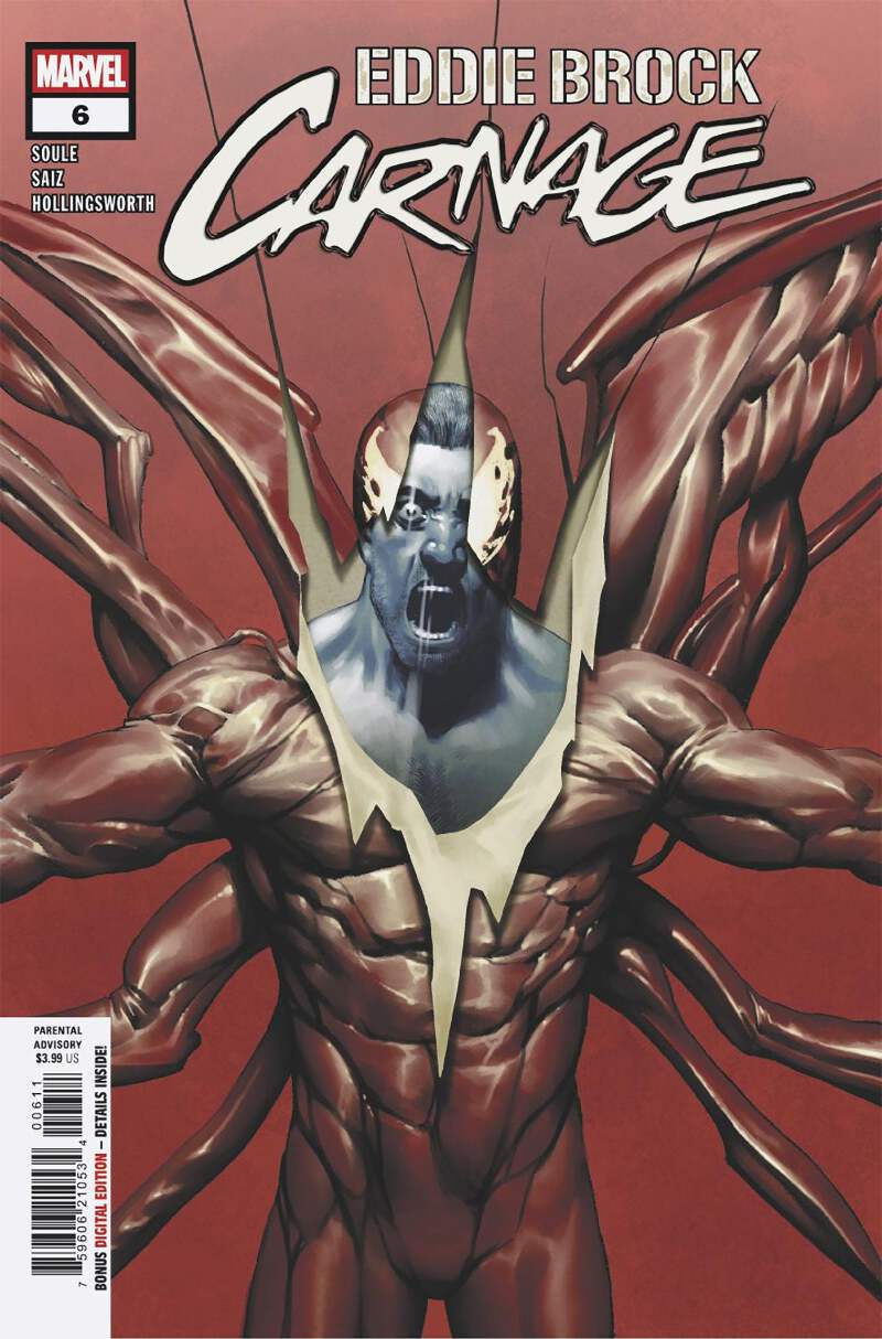 UNCONTROLLABLE CARNAGE! Eddie is losing his grip on Carnage's powers and bloodlust. Can he keep the symbiote's baser instincts at bay until they locate a suitable target? Or will innocent people begin to pay for Eddie's hubris? Meanwhile, back in Chicago, Eddie and Carnage go from Hunter to Hunted as MUSE closes in on who destroyed his studio. RATED PARENTAL ADVISORY.