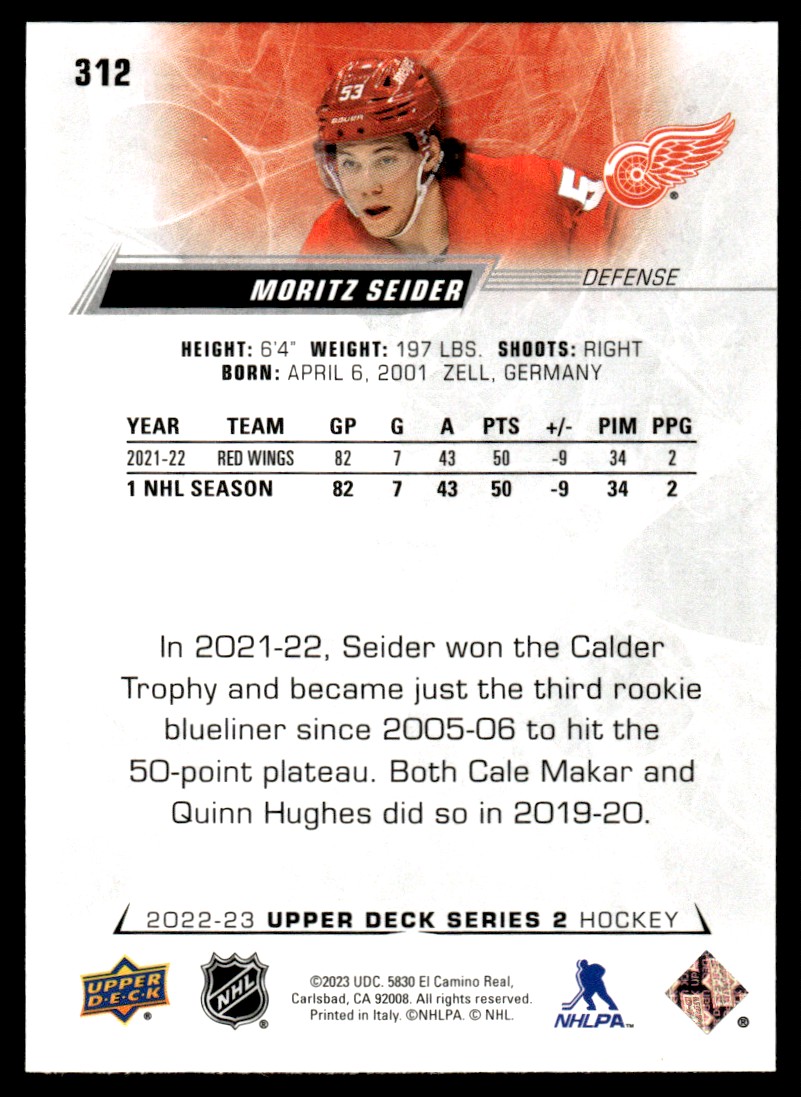 | 2022-23 Upper Deck Moritz Seider Detroit Red Wings #312 |