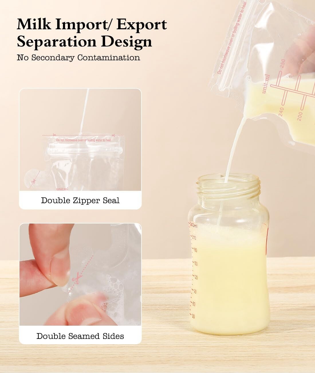 Say goodbye to messy spills and contamination risks! Our innovative pour-spout design lets you pour breast milk directly without touching the sealing strip. Simply tear the pre-cut zipper for a smooth, spill-free flow—keeping every drop pure and safe for your baby.