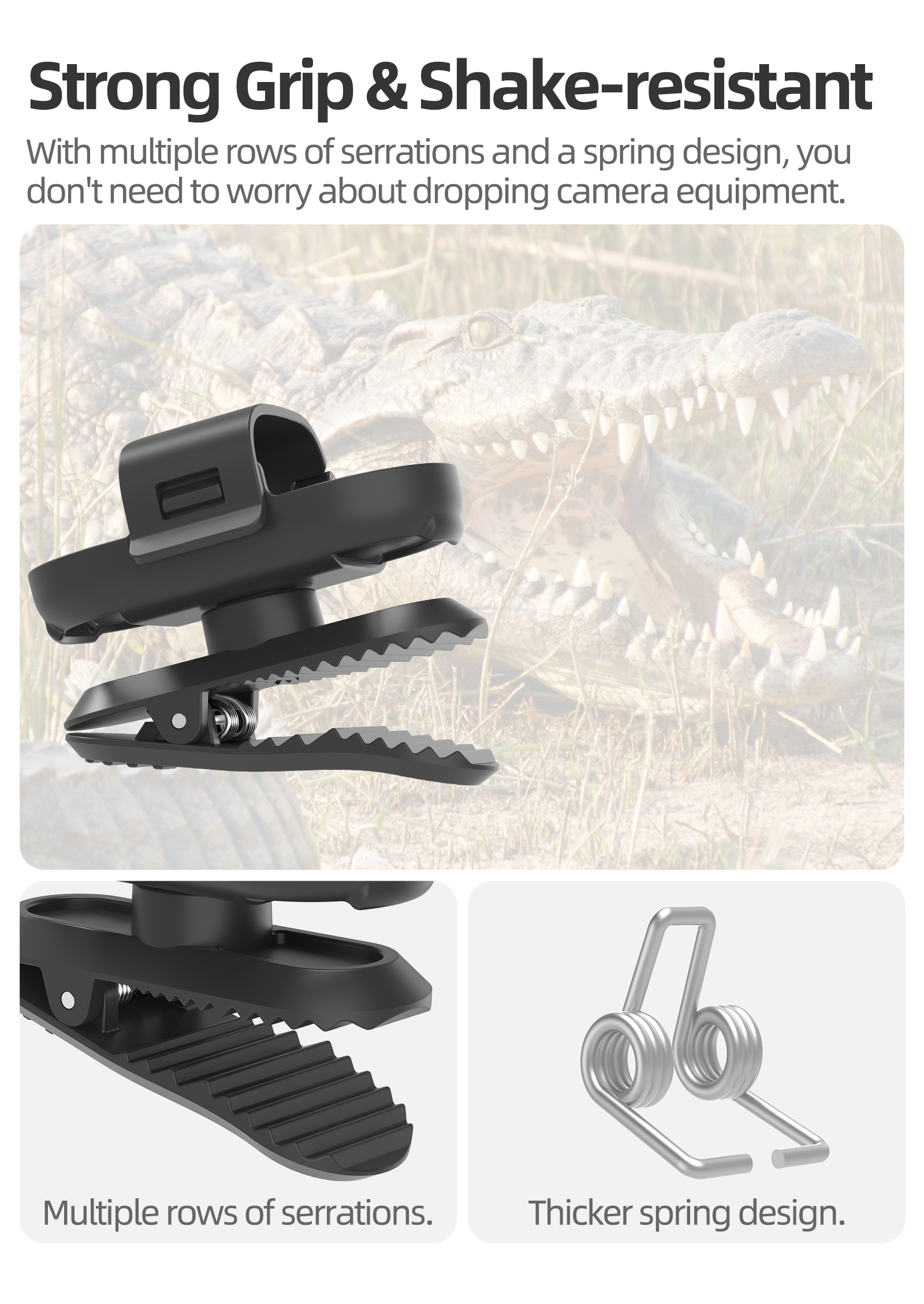 3. crocodile serration, strong clamping. Adopting multiple rows of serrations and springs, you don't need to worry about equipment falling.