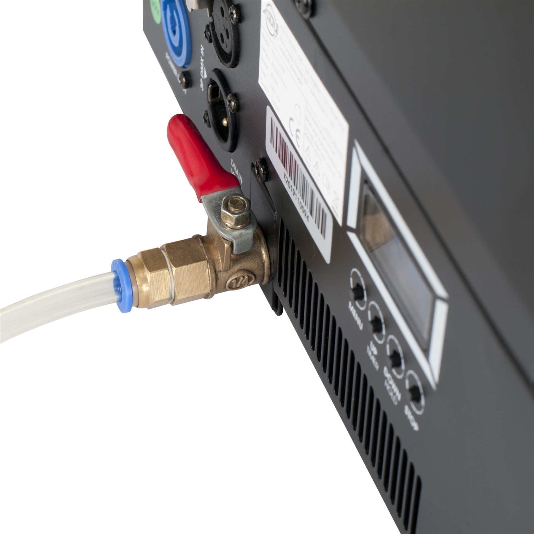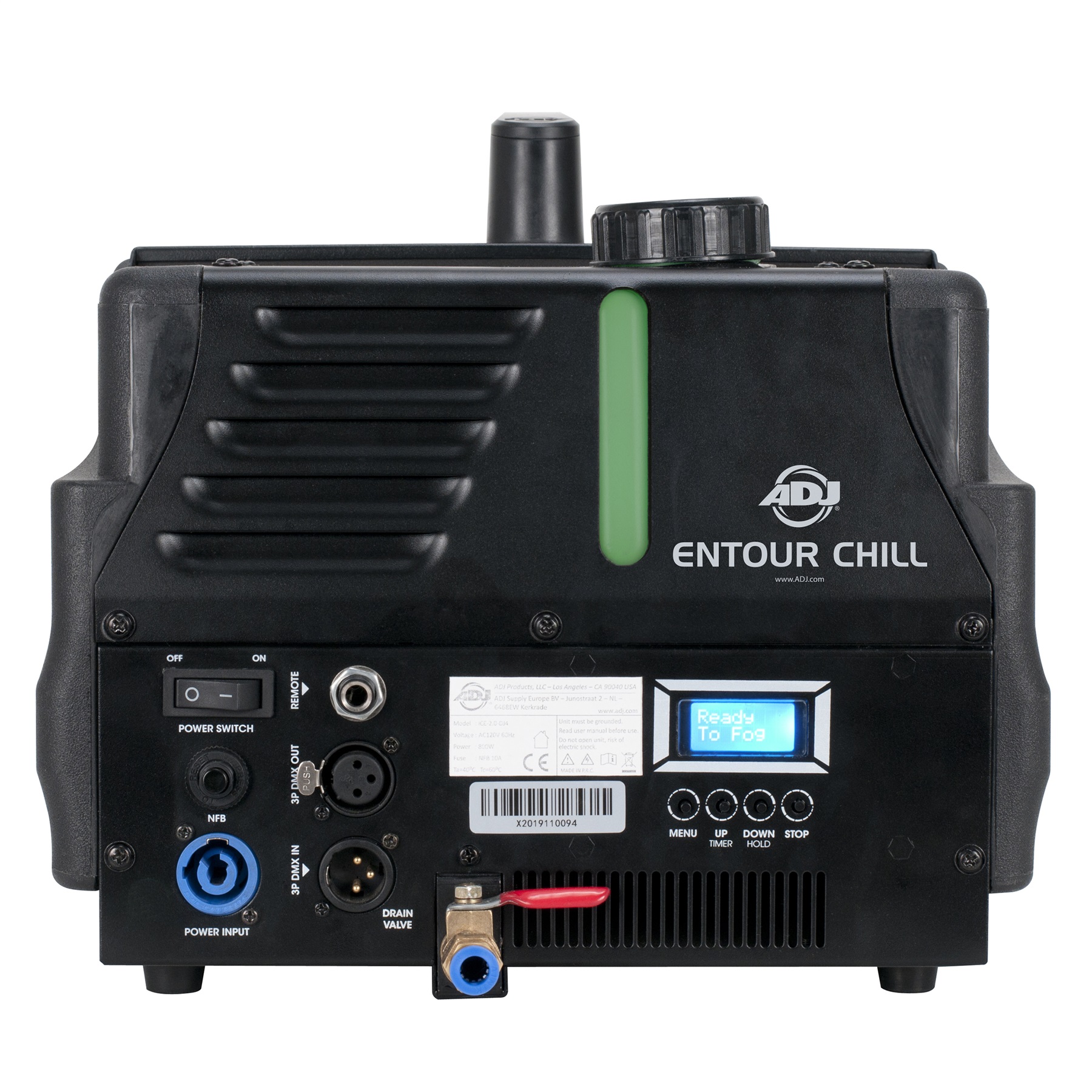The ADJ Entour Chill is a high-output, continuous low-lying fog machine, which uses standard water-based Kool Fog juice and ice cubes to generate an effect similar to that of dry ice. This latest addition to the Entour range of professional DMX-controlled effect generators builds on the success of ADJ’s immensely popular Mister Kool low-foggers, with enhanced technology to allow for increased output. A newly-developed 800W heater system allows for continuous output for up to an hour, while sophisticated new electronic temperature control lets the machine heat up in 3 minutes and stay at optimum temperature ready for immediate firing of the effect when it is required. Featuring an intuitive menu system accessed via a backlit 16-character LCD display, the unit is easy to setup for DMX control, remote control, timed intermittent operation or immediate continuous output. Housed in a rugged, fire-resistant plastic case, the Entour Chill is ideal for use on theatrical productions and concert tours as well as by mobile entertainers and event companies.
