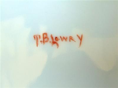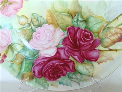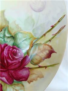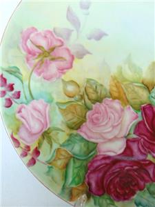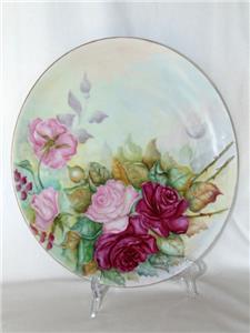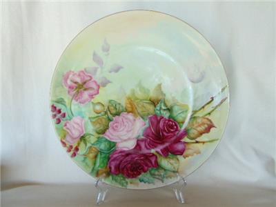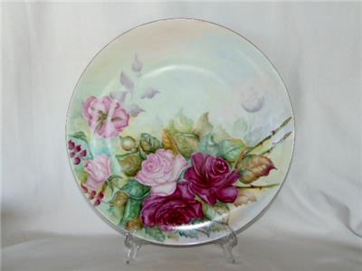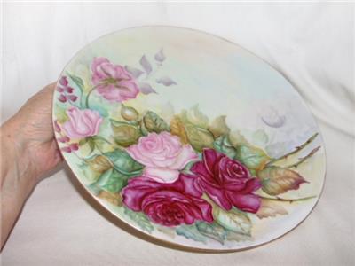 Striking and lovely antique hand painted porcelain charger plate measuring a whopping 12-3/4" wide. Featuring a fine, gold trimmed edge, plate is covered in gorgeous, pink roses in a variety of tones with leave and accompanying greenery. Bearing the original artist's name of T.B. LEWAY, plate is not marked, but is by Limoges, dating early 1900s (the matching serving plates we have are marked Limoges, but we are keeping those for now).