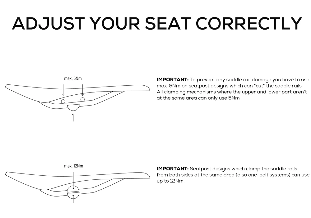 Comply with the torque values indicated by the seatpost manufacturers and, nonetheless, avoid exceeding 8 Nm for carbon rails and 15 Nm for metal rails. Proper tightening of the saddle will prevent the latter from moving. Carry out periodic checks and make sure that the saddle adjustment