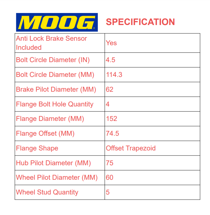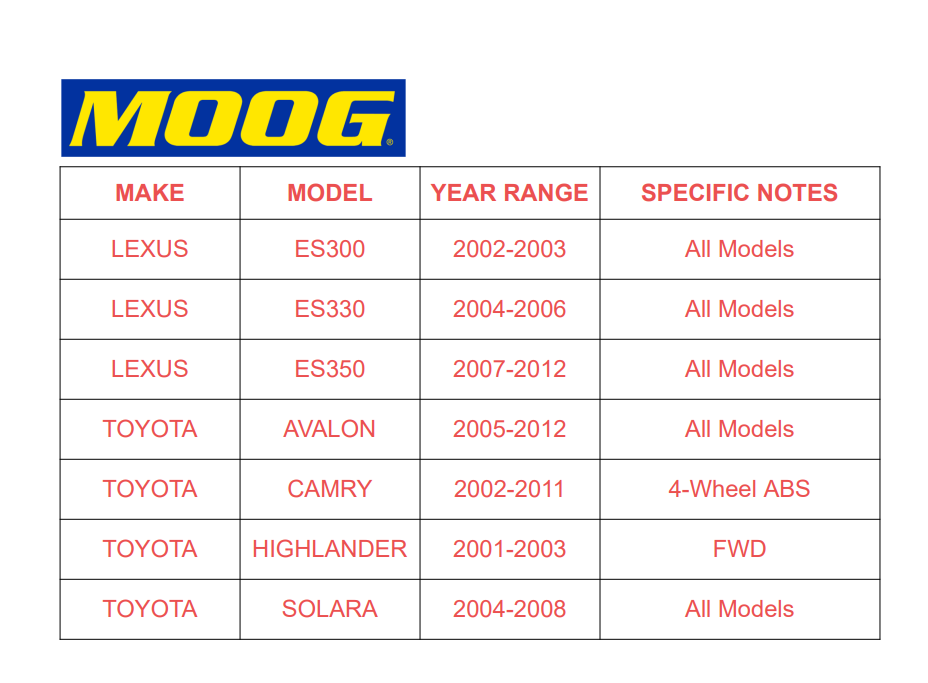MOOG 512207 Rear Wheel Hub Bearing For Toyota Solara 04-08 Avalon Camary Touring