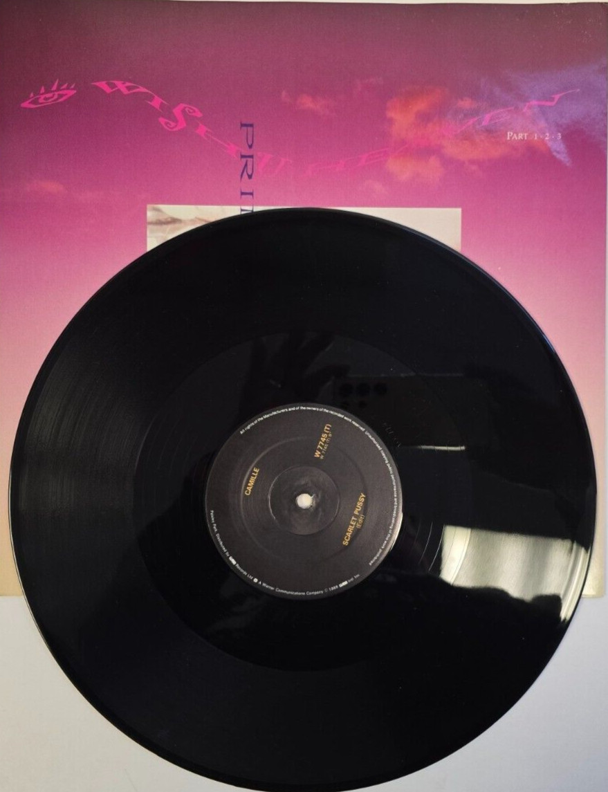 Released in 1988 as the third single from Lovesexy, I Wish U Heaven showcases Prince’s spiritual optimism wrapped in shimmering synths and layered falsetto. This European 12″ maxi-single features the rare extended mix (Parts 1, 2 & 3) and the provocative B-side Scarlet Pussy, credited to Prince’s alter ego Camille. Packaged with a one-sided six-panel poster sleeve, it’s a collector-grade gem for boutique bins and Minneapolis sound retrospectives.