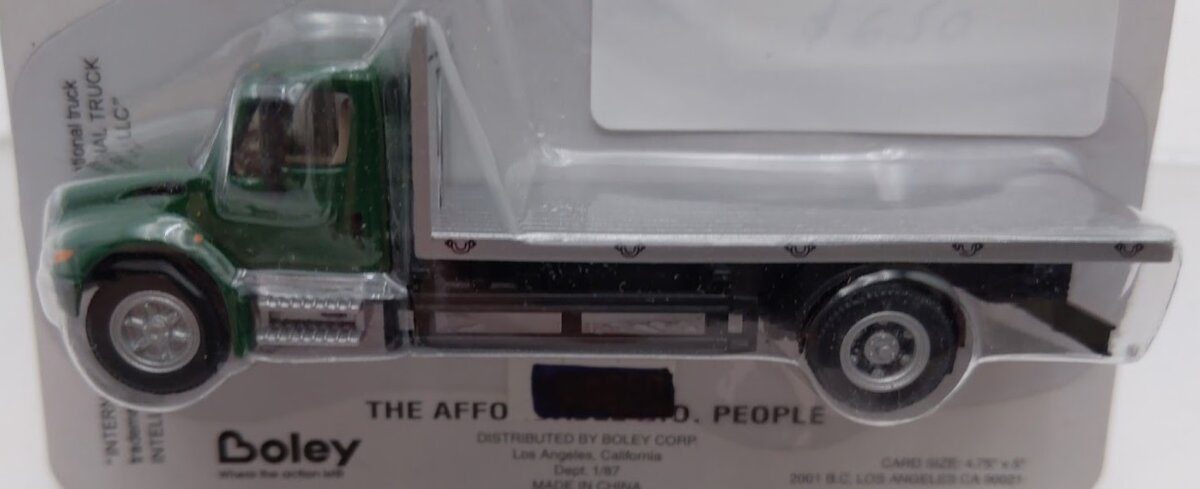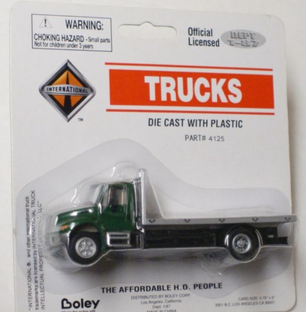 This is a Boley 4125-56 1:87 Green/Silver 01 International 2-Axle Flatbed Die Cast W/Plastic Parts.