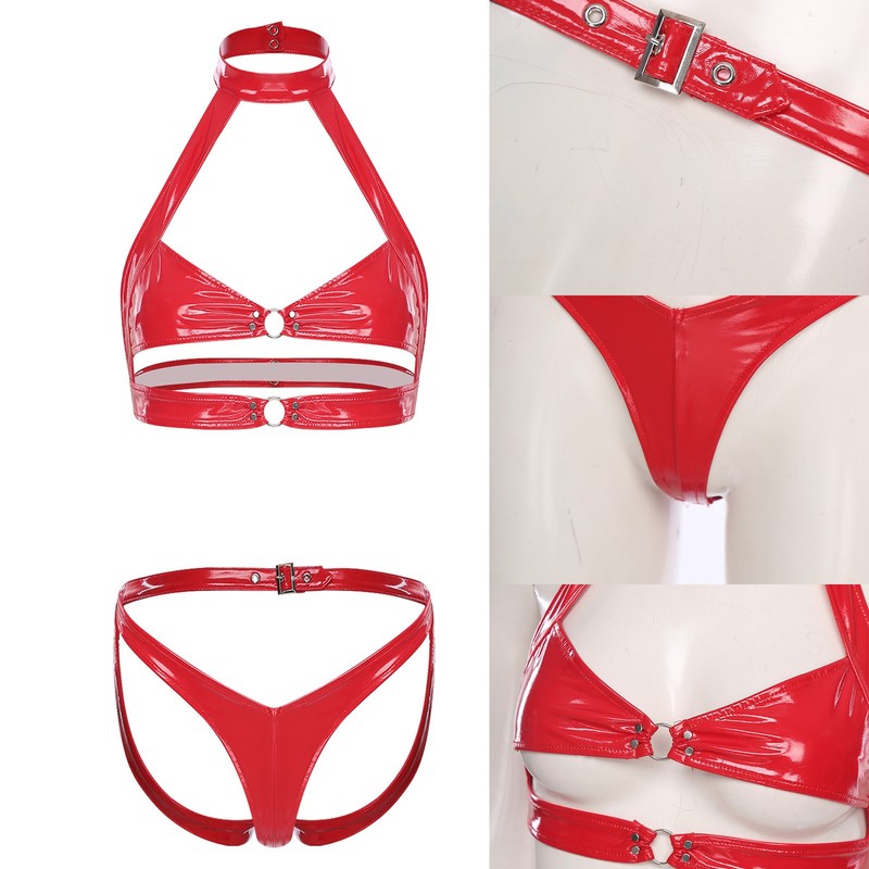 Crafted from high-quality PU and alloy, this lingerie set offers a unique wet-look finish, adding a trendy and eye-catching element to your style.