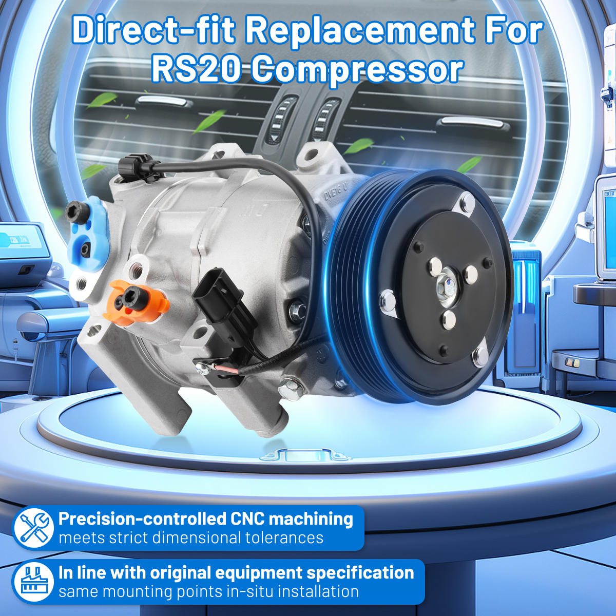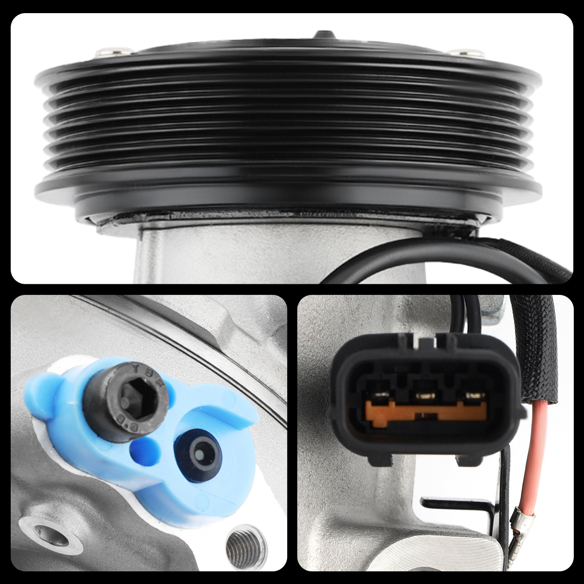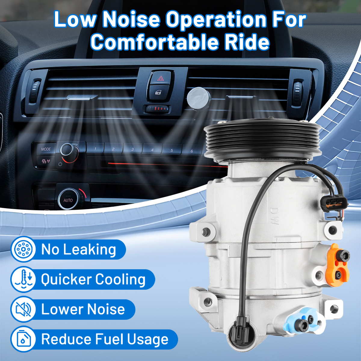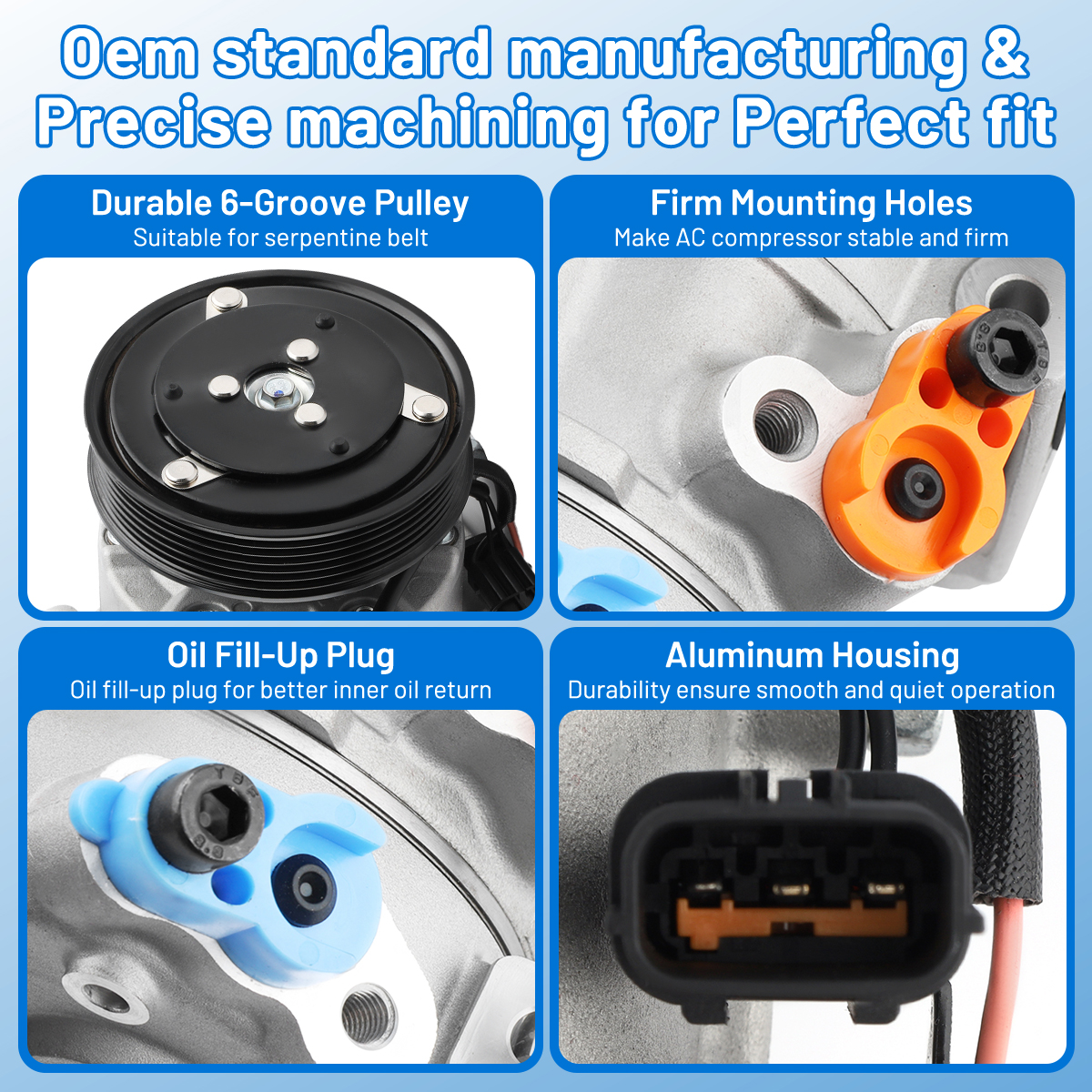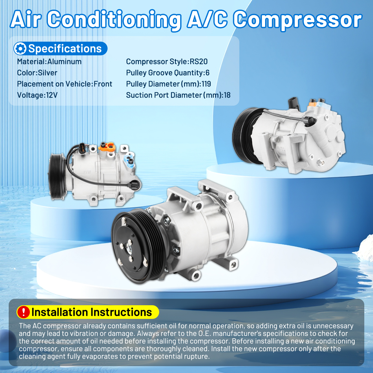 Features: Built to strict quality control standards 100% factory tested. 100% Compatible with OEM Parts, meets Original Equipment Manufacturer (OEM) Standards. This powerful auto AC compressor can provide intense pressure to achieve strong cooling effect, and it also manifests excellent performance in dissipating heat and ventilation.Longer life of the alternator through the use of premium brushes and other critical components that resist failure or poor performance. Our AC compressor kit works efficiently under low noise and tiny vibration to provide you a super cool trip. Driving at a stable speed will help reduce fuel consumption. The compressor is mainly made of high-strength aluminum alloy, therefore, it is not only durable but also ensures stability and a real long service life. Specifications: Material:Aluminum Color:Silver Placement on Vehicle:Front Voltage:12V Compressor Style:DVE16 Pulley Groove Quantity:6 Pulley Diameter (mm):120 Suction Port Diameter (mm):19 Part Numbers: CO 11230C, 977012S500, 977012S500AS1, 977012S500DR, 977012S500RM, 977012S502, 977012S502AS1, 977012S502DR, 1177305, 178305, 177305 Fitment: Hyundai Tucson 2011-2013 L4 2.0L Hyundai Tucson 2010-2015 L4 2.4L Kia Sportage 2011-2016 L4 2.0L Kia Sportage 2011-2016 L4 2.4L Package include: Attention: 1.Remove compressor, receiver drier or accumulator, orifice tube or expansion valve. 2.Flush the condenser and evaporator using NON-OIL BASED A/C flush. On expansion valve systems. The valve must be removed before the evaporator can be flushed. Flushed condensers from outlet to inlet and evaporators from inlet to outlet. 3.Drain all the oil from the new compressor and dispose of according to local, state and federal laws. (NOTE: if your compressor has a drain plug, you will need to open it up and drain what oil is in there too.) 4.Install half oil charge into the compressor and the remainder throughout the system. Turn compressor shaft 8-10 full revolutions to insure front seal and other internal parts are lubricated. 5.Install new receiver drier or accumulator and new orifice tube or expansion valve. 6.Evacuate the A/C system for a minimum of one hour. 7.After evacuation install half the refrigerant charge and let the system set for 1 minute. This will allow the refrigerant to pick up oil and spread more evenly throughout the system. 8.Start engine whit A/C controls on MAX AIR with door and windows open. 9.Add the remaining charge of refrigerant as called for by the manufacture. Note: It is necessary to add appropriate amount of oil and refrigerant to the ac compressor before use.