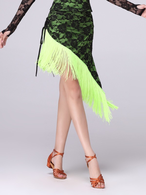 The floral lace and tassel trim add a touch of elegance and femininity, making the skirt a trendy and fashionable choice for dancers.