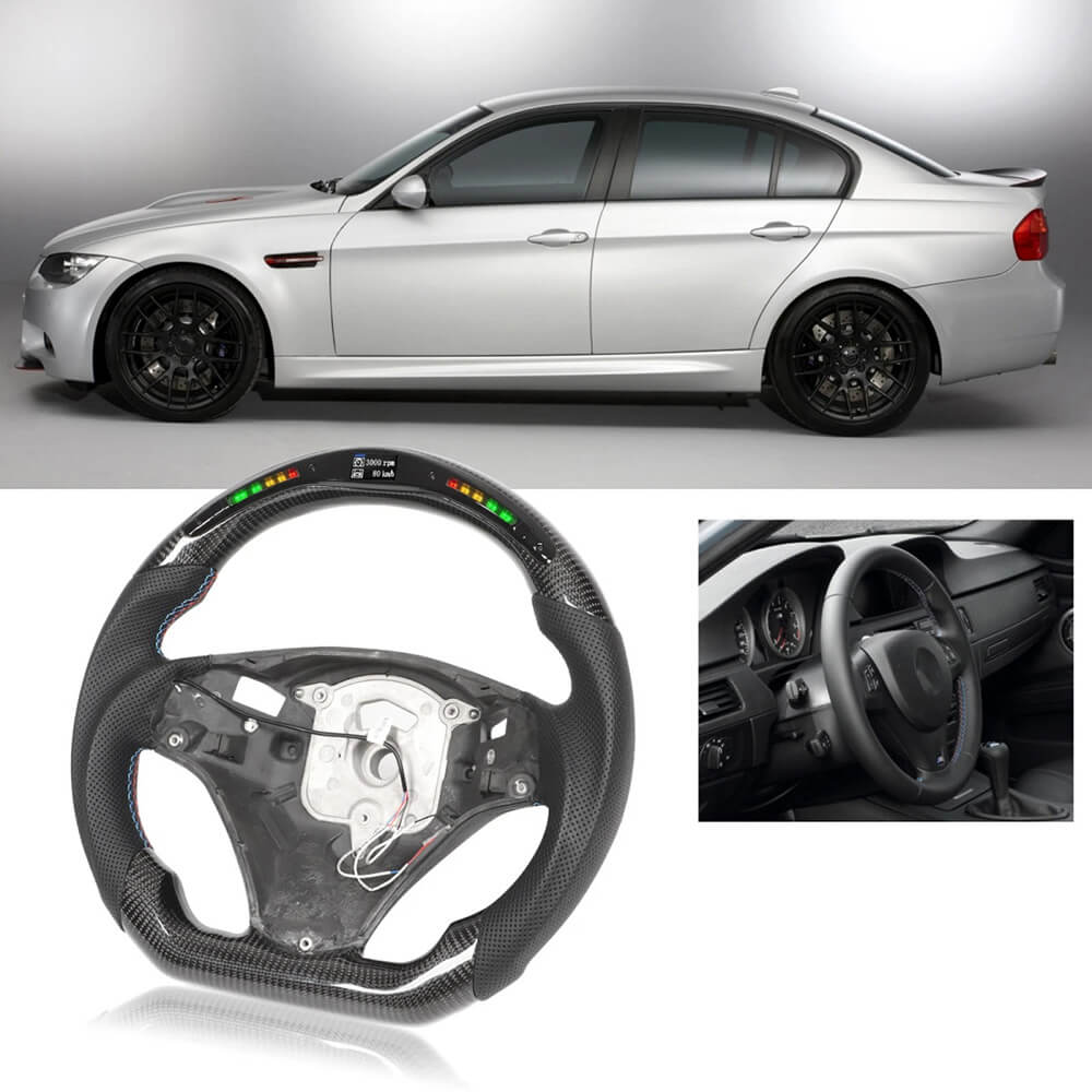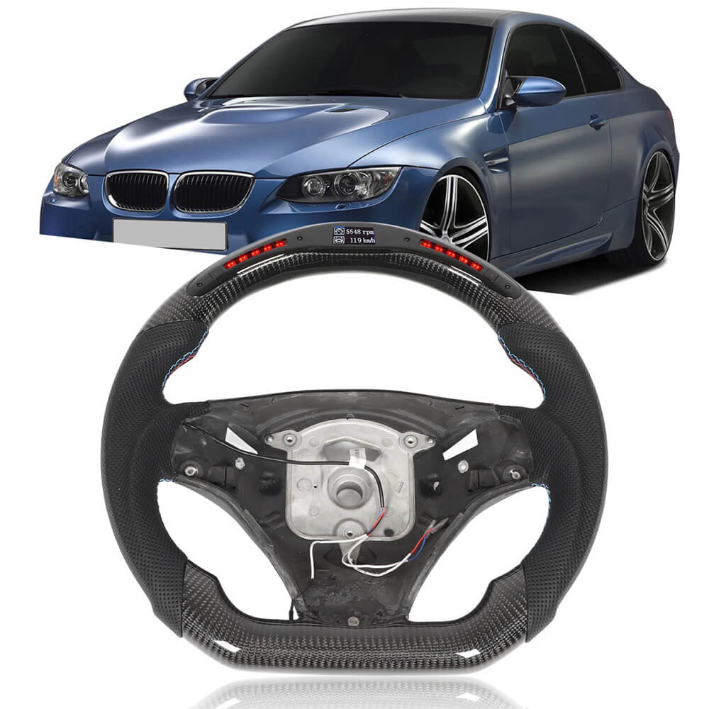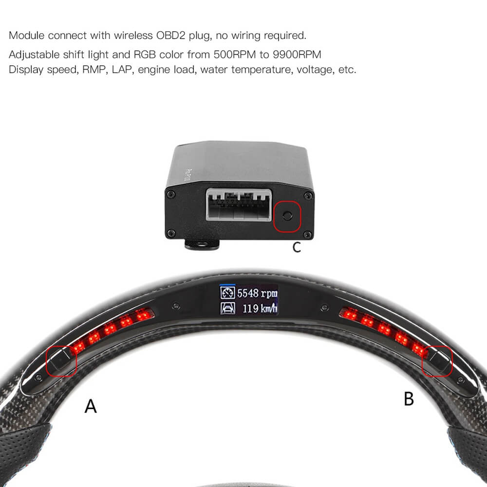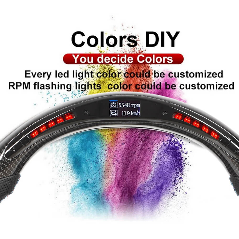 [LED Display Steering Wheel] : LED shift indicator includes 5 sets of LEDs on each side of the steering wheel that lights up gradually in green as the engine RPM increases. Once it reaches the user configured RPM, the indicator flashes red as an up shift reminder. LED shift indicator color and RGB color is adjustable from 500RPM to 9900RPM.