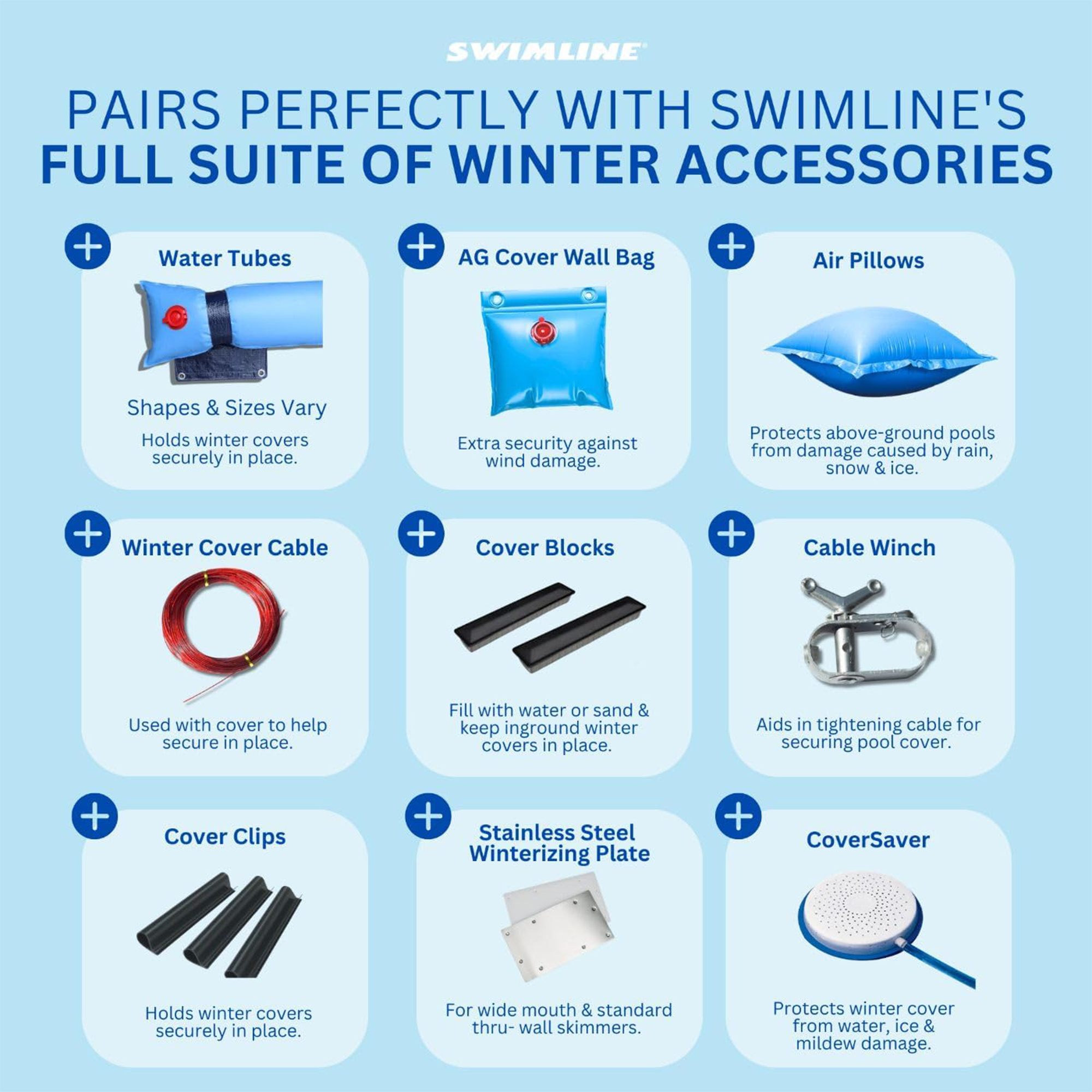 Moreover, our pool covers are not standalone solutions but part of a wider protective system within the Hydrotools by Swimline expansive assortment of pool accessories. They pair seamlessly with our extensive range of winterizing accessories such as ice equalizer air pillows, water tubes, and wall bags. With the integrated perimeter grommets, you can use these accessories for additional support and peace of mind.