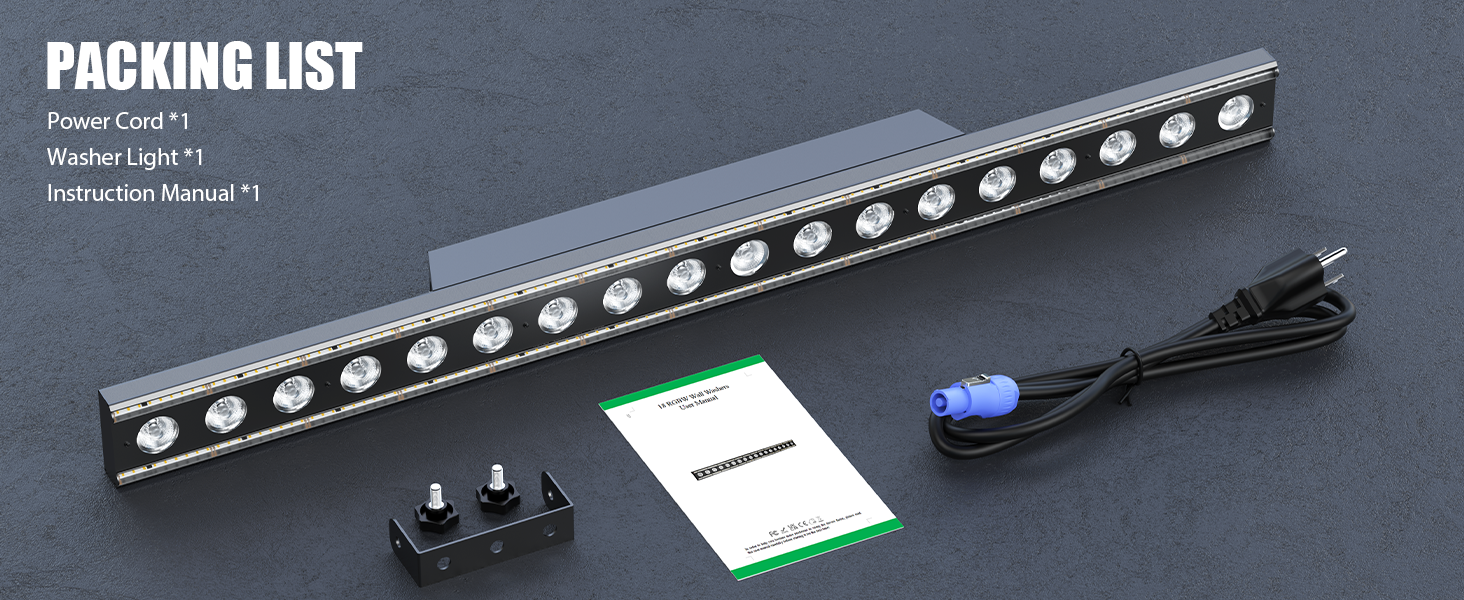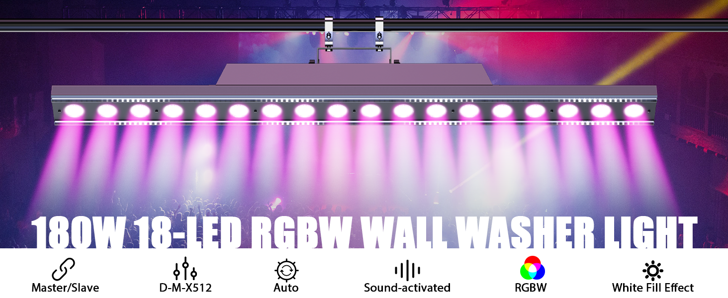 180W 18-LED RGBW Wall Washer Light Features 29 Running Chase Modes&59 White Fill Light Effects Supporting Independent Control Mode and 3-LED Group DMX Control for Home Entertainment, Stage Performances, Clubs, And Event Venues