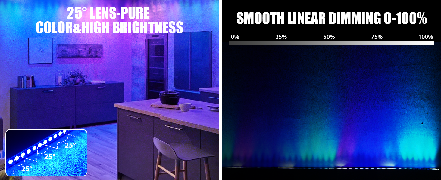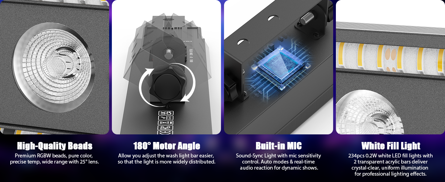 l 18pcs 10W RGBW LEDs with 25° high-brightness lenses deliver pure colors, intense brightness & even blending