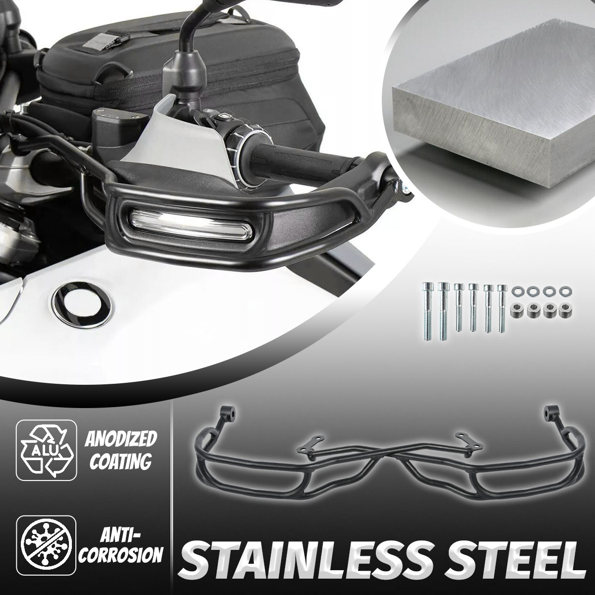 This solid hand guard set for the left and the right side reliably protects your hands and your handlebar in case of a downfall.