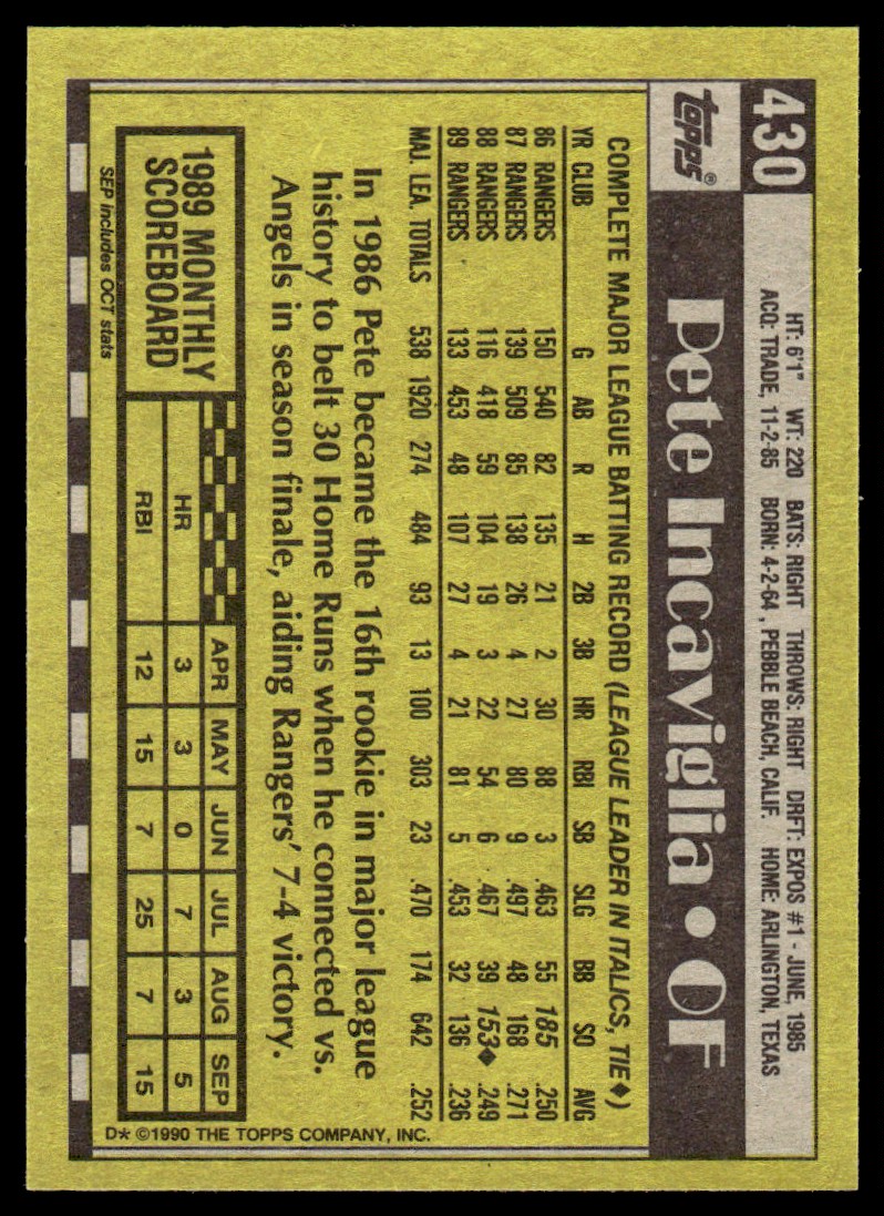 | 1990 Topps Pete Incaviglia Texas Rangers #430 |