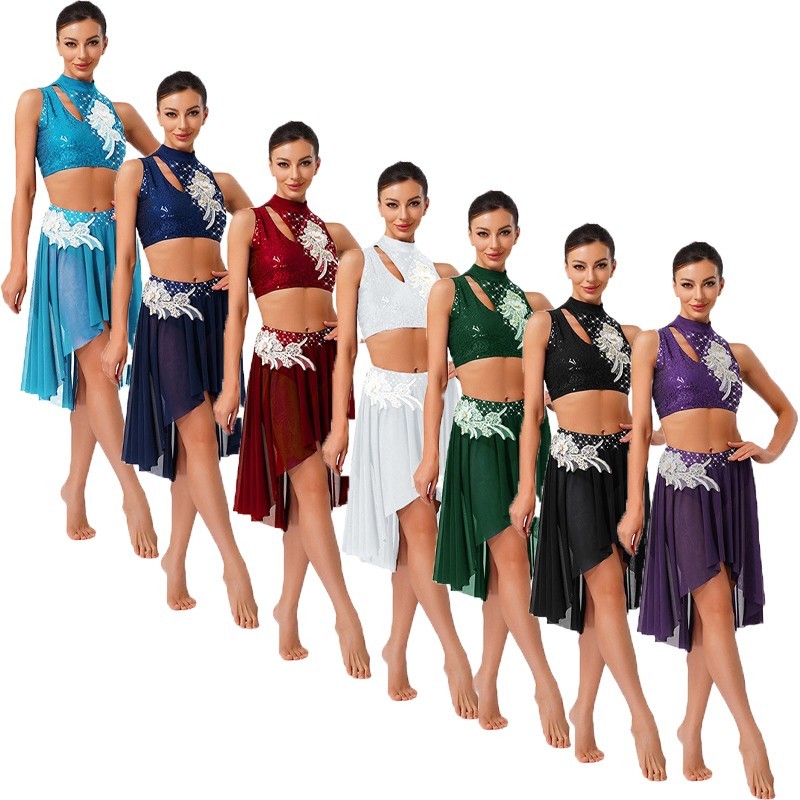 Women Applique Lyrical Dance Outfits Sleeveless Tops Irregular Skirted Leotard