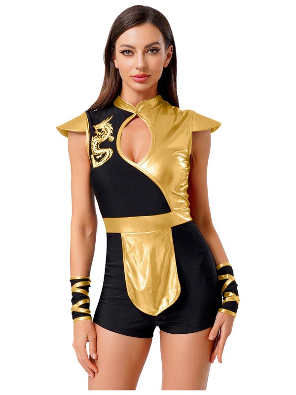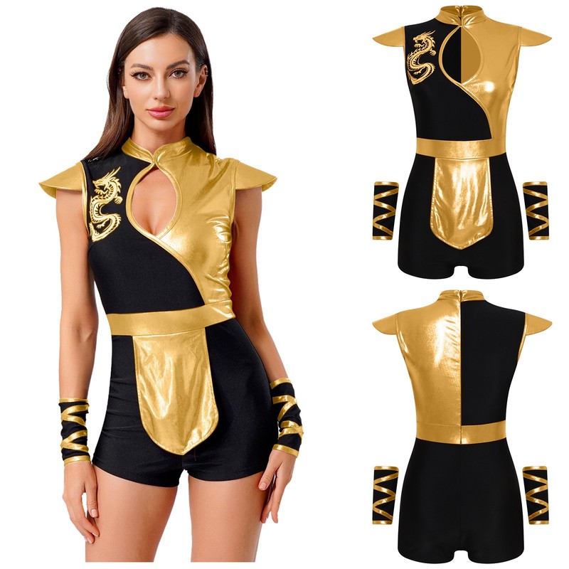 The dragon print pattern and metallic shiny patchwork are eye-catching and on-trend, making the wearer stand out in the crowd.