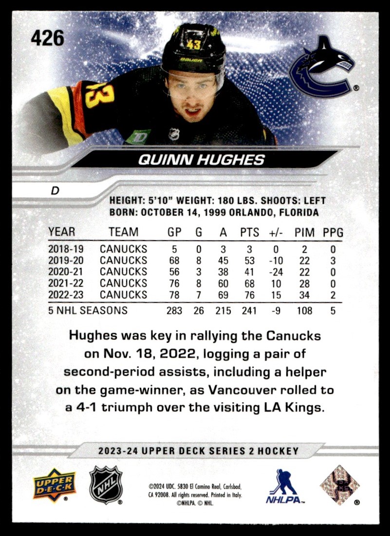 2023-24 Upper Deck' Quinn Hughes Vancouver Canucks #426