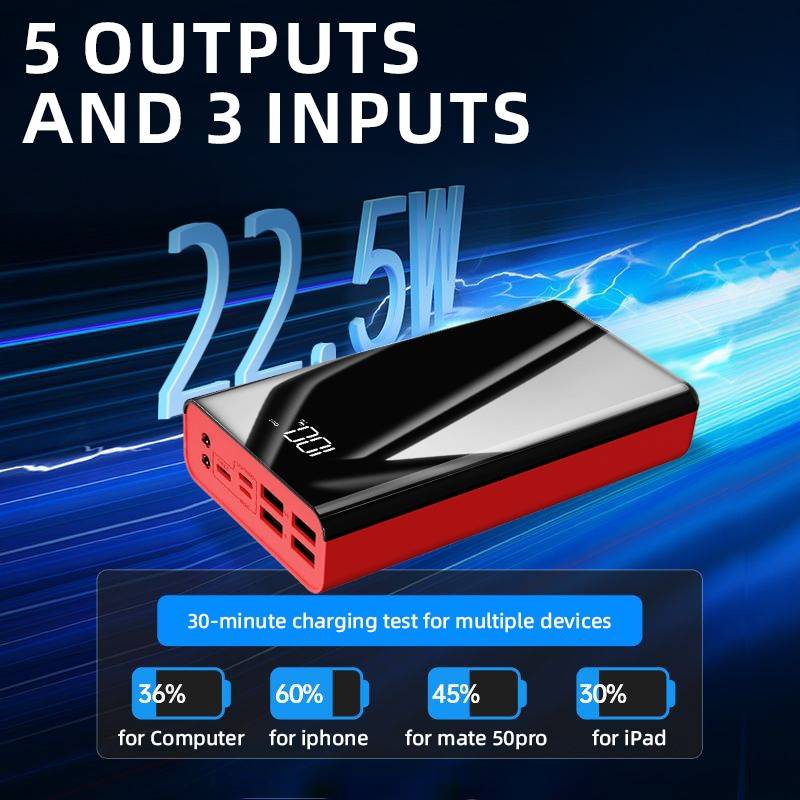 【3 Eingänge und 5 Ausgänge】Der externe Akku kann mit einem Kabel 20W USB C oder Micro USB aufgeladen werden. Die 2 22,5W USB-A und 1 20W USB-C Ausgänge ermöglicht das gleichzeitige Aufladen von drei Geräten. Teilen Sie den powerbank gerne mit Ihren Freunden.