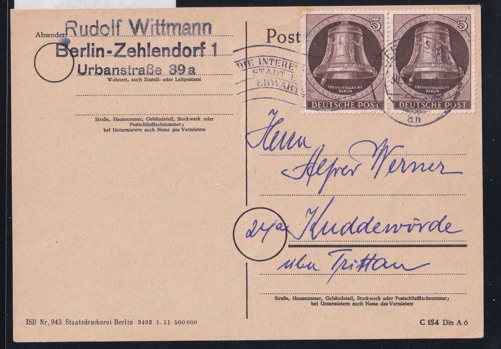 5 Pfenning Glocke links im Paar als portogerechte Mehrfachfrankatur auf Postkarte am 30.11.1951 von Berlin nach Trittau gelaufen.