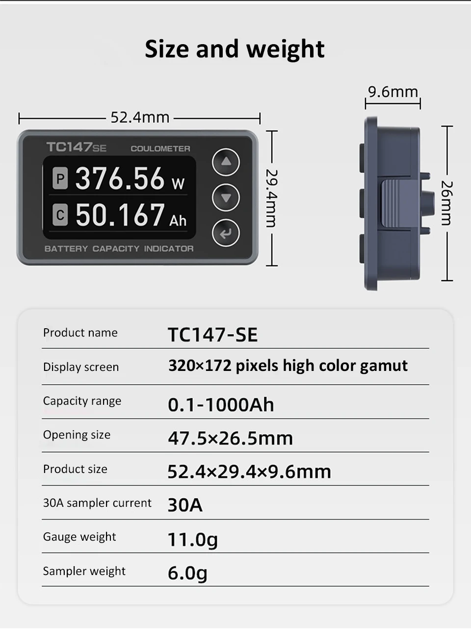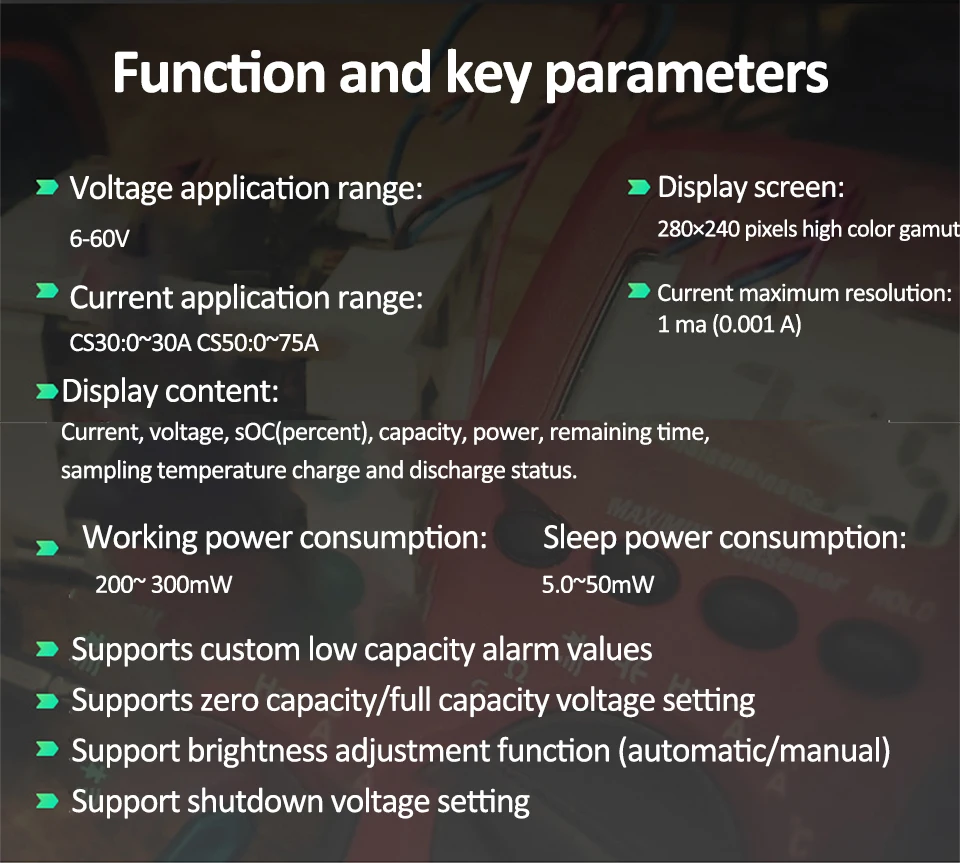 Display content: current, voltage, SOC (percentage), capacity, power, remaining time, sampling temperature, charge and discharge status.