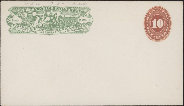 Mexico, 1886. Wells Fargo Envelope, 1/2 oz, Size a, 10c red numeral, without Mexico line 1. UPSS WF 48, H&G 32, 15 ctvo. in frank. Flap not adhered. Mint, F-VF.