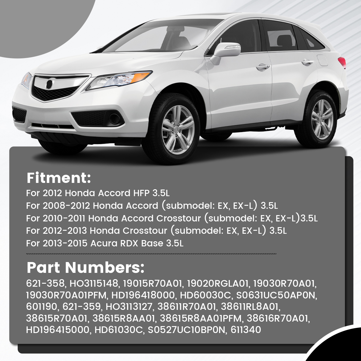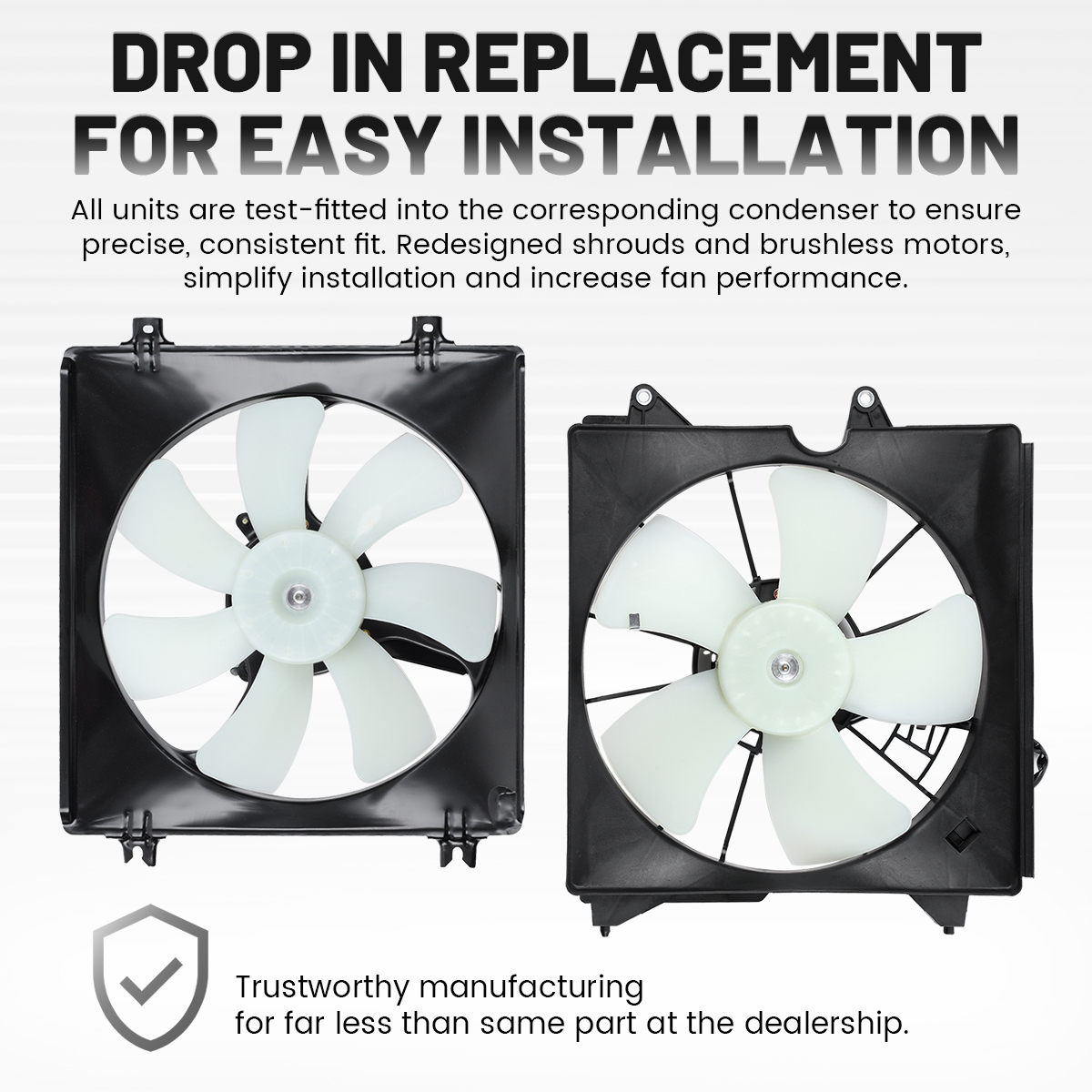 Features: 1.Drop in replacement for easy installation.All units are test-fitted into the corresponding condenser to ensure precise, consistent fit. Redesigned shrouds and brushless motors, simplify installation and increase fan performance. 2.Ideal replacement.This engine cooling fan assembly was precision-engineered to match the fit and performance of the stock radiator fan assembly on specific vehicles. 3.Statically and dynamically balanced preventing assembly misalignment and excess noise for quiet operation.Shrouds are ribbed which increase strength and rigidity of the entire assembly under load forces from airflow thrust and rotating blade torques. 4.All fan assemblies are durability tested for countless hours at elevated temperatures above 260°F as well as being wind tunnel tested to ensure a direct match to the original fan assembly for cooling airflow versus input amperage.Ensure reliable performance for the life of the vehicle. 5.Trustworthy manufacturing for far less than same part at the dealership. Specifications: Material:Plastic Color:Black Installation position:directly behind radiator Quantity of Blade:5+7 Connector Terminal Quantity:2+2pin Voltage:12 Fitment Type:Direct Replacement Part Numbers: 621-358, HO3115148, 19015R70A01, 19020RGLA01, 19030R70A01, 19030R70A01PFM, HD196418000, HD60030C, S0631UC50AP0N, 601190 621-359, HO3113127, 38611R70A01, 38611RL8A01, 38615R70A01, 38615R8AA01, 38615R8AA01PFM, 38616R70A01, HD196415000, HD61030C, S0527UC10BP0N, 611340 Fitment: For 2012 Honda Accord HFP 3.5L For 2008-2012 Honda Accord (submodel: EX, EX-L) 3.5L For 2010-2011 Honda Accord Crosstour (submodel: EX, EX-L)3.5L For 2012-2013 Honda Crosstour (submodel: EX, EX-L) 3.5L For 2013-2015 Acura RDX Base 3.5L Package Contents: Attention: The radiator cooling fan is an integral part of your car that is responsible for cooling the radiator of your car. The radiator cooling fan does this by either pulling or pushing air into the radiator keeping the radiator temperatures within the safe levels. A damaged radiator cooling fan is a determining factor in preventing your car from overheating. Below are the materials that you need along with the instructions on how to replace a radiator cooling fan. Step 1: Locate the Radiator Cooling Fan Locating the radiator cooling fan is the first step in replacing it. Turn off your car and allow it to cool off. Open the hood of your car and you will be able to see the radiator that is located at the back of the grill at the front portion of your engine compartment. The radiator cooling fan is attached at the back of the radiator through a mounting frame. Under the engine and the radiator is a sticking cylinder that is encased in a small casing. That is the radiator cooling fan motor that you may need to change or repair other than the radiator cooling fan itself. Step 2: Disconnect the Power Supply On the fan motor is an electric cable running towards the engine. Find the connector of the wires from your engine and from your radiator fan motor and disconnect it. Using two masking tapes with different colors, note the connection of the wires so that you will not have a hard time reconnecting the wires later. Step 3: Remove the Fan Housing Using a crescent wrench, remove the four screws located at each corner of the fan housing. Remove the fasteners at the sides of the fan housing as well. A radiator cooling fan housing is relatively large and you may need to remove all the obstructions like hoses and wirings so that you can extract the fan housing off your car hood. Hold the housing firmly and lift it off your engine compartment. Be careful in removing the fan housing to avoid damaging it. Place the fan housing on a clutter-free working table. Step 4: Remove the Radiator Cooling Fan and the Fan Motor The fan blade is either pinned or screwed to a shaft. With a screwdriver, loosen the fan blade and slide if off its shaft. You may need to remove a keeper that prevents the fan blades from moving up in the shaft up and down. As to the fan motor itself, remove it from the fan housing using a screwdriver. Step 5: Attach the Replacement Radiator Cooling Fan and Fan Motor Install the new fan motor into the fan housing. Slide your replacement radiator cooling fan into the shaft, insert the keeper and secure the new cooling fan and keeper into place. Return the fan housing back into its proper place and secure the screws and the fasteners. Reattach the hoses and wires you removed in step 3. Connect the fan motor into the car electrical system using the electrical tape guide you made in step 2. Note: You may notice that the Cooling fan needs diagnostics by the following signs: 1. the engine is overheating. 2. the fan sensor is functioning incorrectly. 3. the engine loses power at higher RPM. 4. "Check Engine" flashing on the dashboard. Please Carefully Check Whether the OE Number And Picture are What You Need Before Buying. If You are Not Sure Whether It Fits, Please Write to us. If There are Any Problems, Communication by Letter Will be More Effective. No Instruction Included, professional installation is highly recommended.
