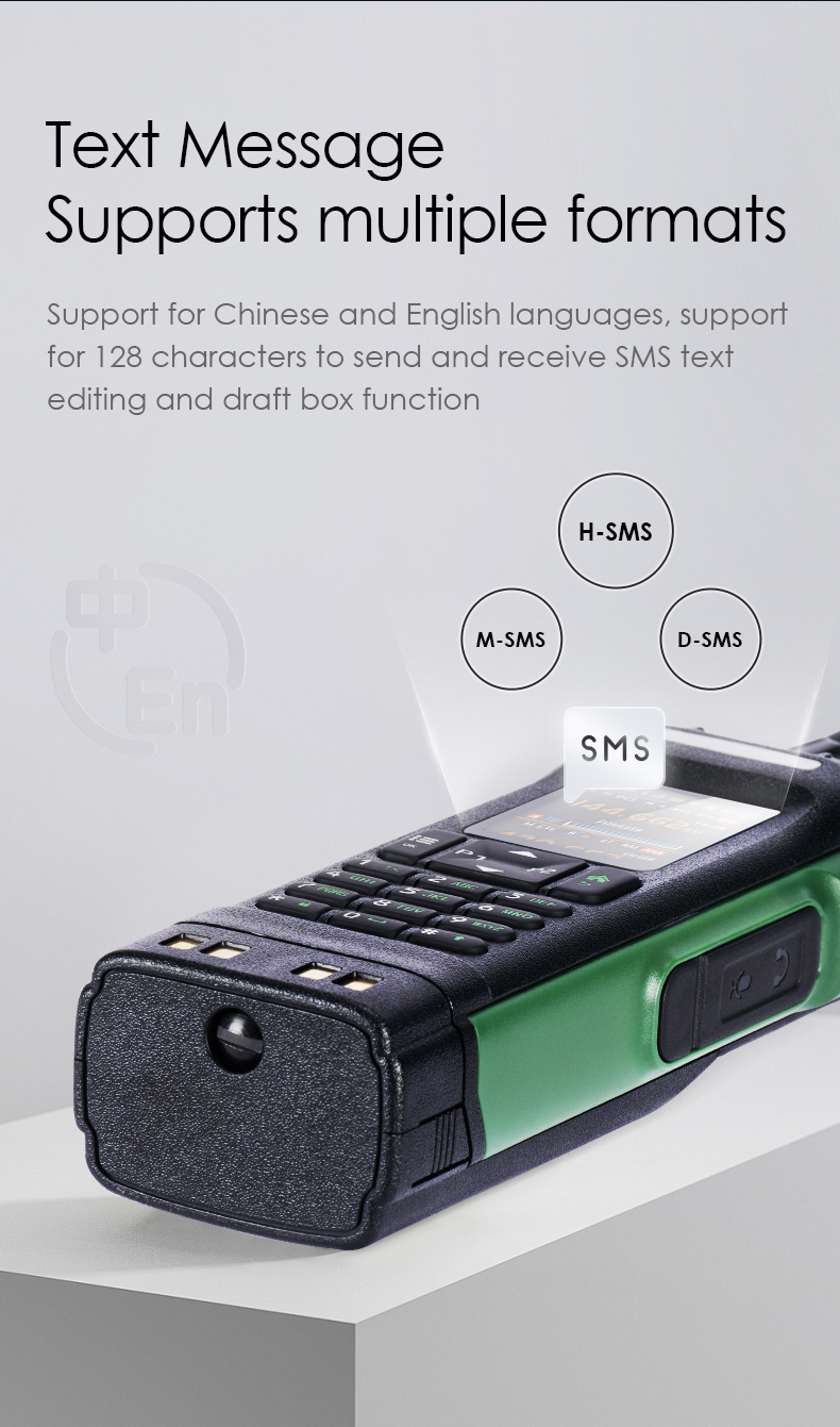–Text SMS function Chinese and English language support, support 128-character SMS sending and receiving, text editing and draft box functions. Supports M-SMS, H-SMS, and D-SMS SMS formats
