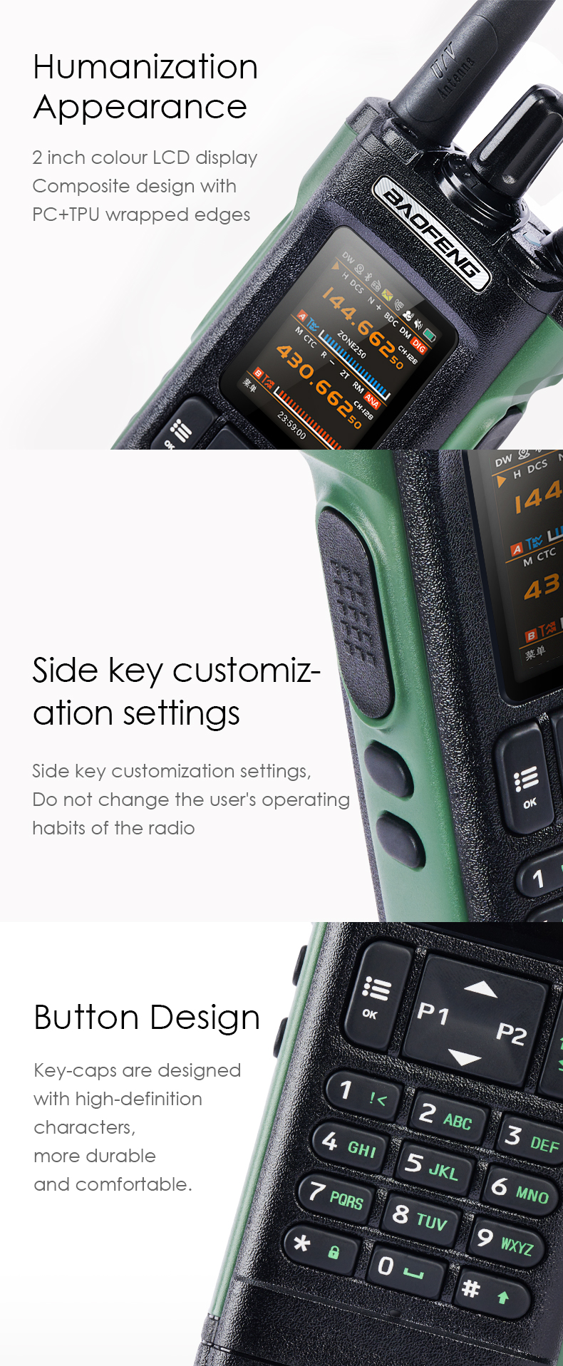 · One-key frequency binding in analog mode, digital monitoring, channel and frequency scanning · Independent work, digital alarm function · Side key custom settings, without changing the user’s operating habits of the machine · Satellite positioning, APRS automatic position reporting, FM radio function · Support APRS, roaming.