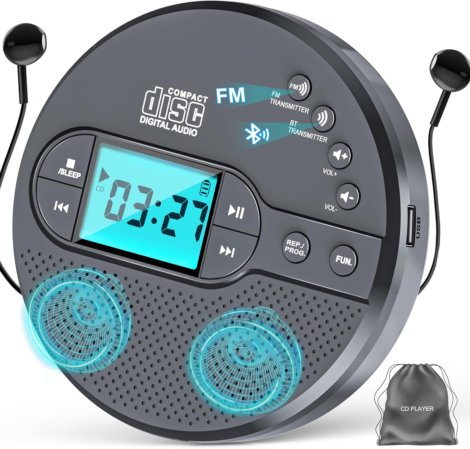 【2000 mAh Battery and Backlight Display】If you are passionate about outdoor trips or sports, then don't miss this portable cd player! 2000 mAh battery lasts up to 9 hours, which supports us to use it for a long time outdoors. The backlight LCD display makes it clear even in dark environments, so it's perfect for nighttime use.This discman cd player also has a USB port, so we can download the music onto the USB, then insert it into the CD player and select the USB mode to play our favorite music