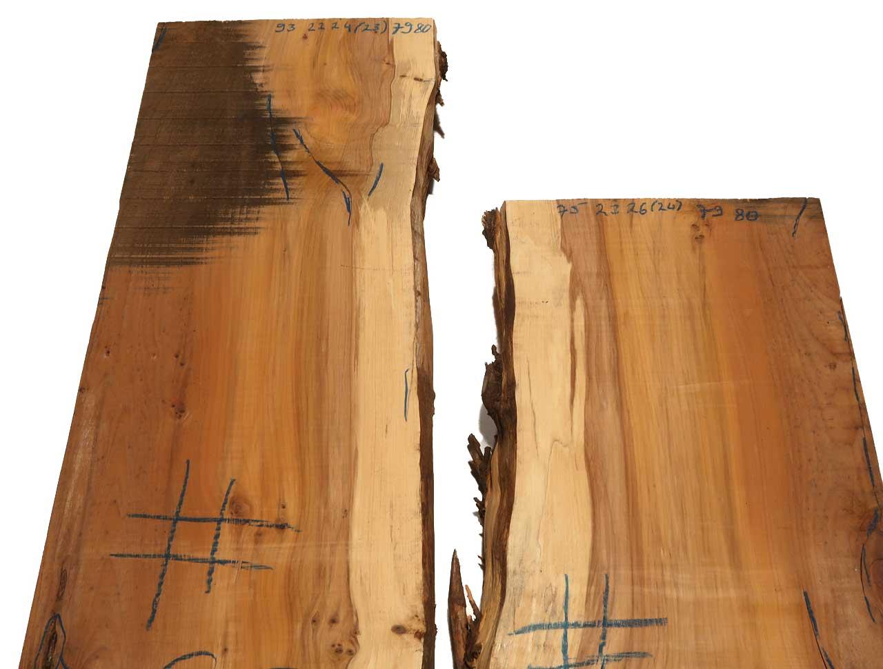 Hierbei handelt es sich um ein Eibenholz Brett oder Bohle. Dem wunderschönen rötlich- bis orangebraunen Holz mit maserartigen angeordneten Punkten, lassen sich exklusive Möbel und Einlegearbeiten (Intarsien) herstellen. Besonders dekorativ ist der Übergang zwischen Splint- und Kernholz, welcher klar definiert ist. Bitte achten Sie darauf, dass bei wilden Maserungen, wie bei Eibe üblich, feine Haarrisse oder Verwachsungen & Einwüchse zum Beispiel von Rinde vorkommen können. Möglich vorhandene markante Merkmale wie feine Haarrisse, Risse, Äste, Einwüchse, Fehlstellen ... usw werden so gut es geht mit Farbe (Kreide) markiert!